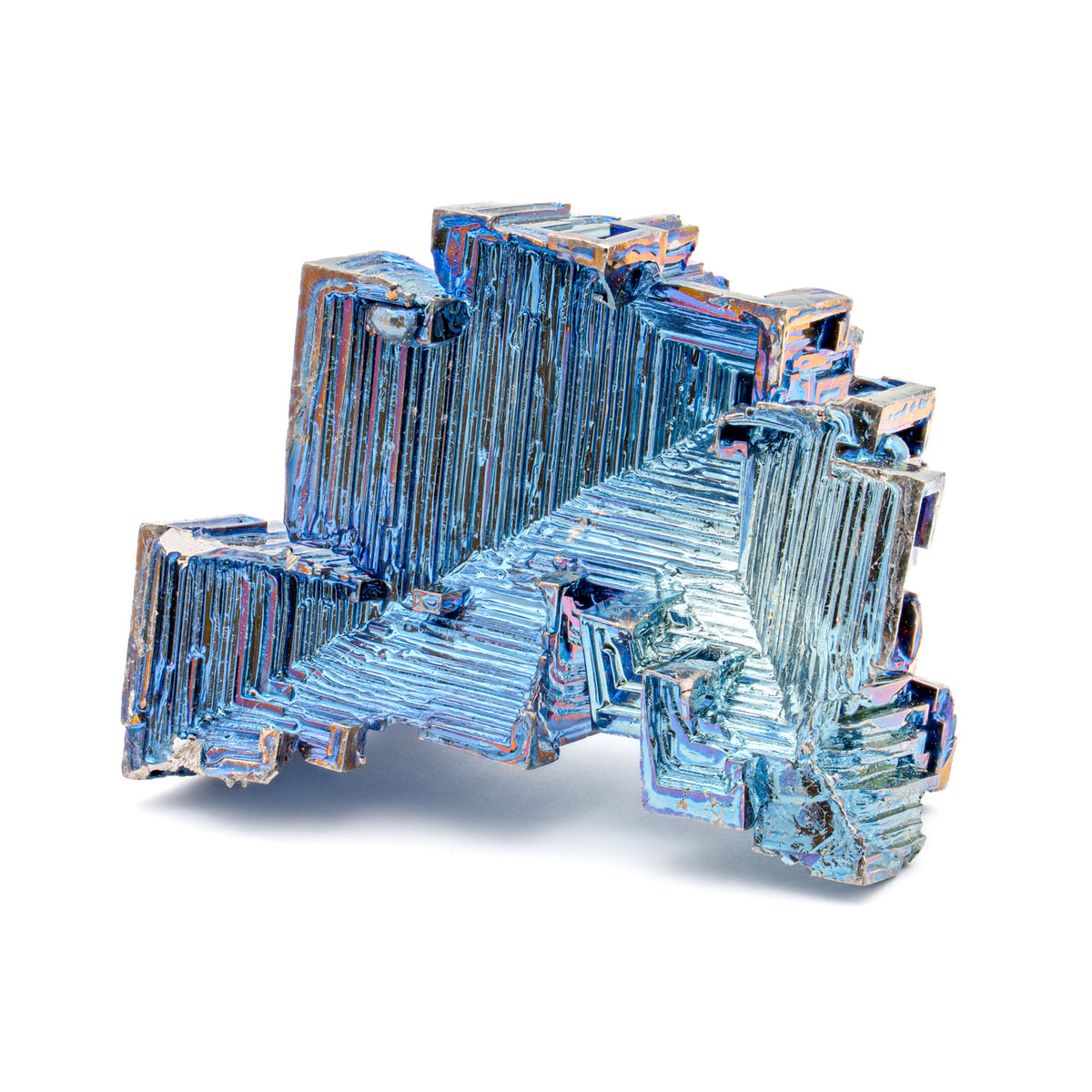 Bismuth is an element (Bi 83) best known for its unusual staircase shape, the result of bismuth atoms attaching to the edge of a rapidly growing crystal. This is called hoppering, when atoms are drawn to the edge of a structure, creating a lattice formation.