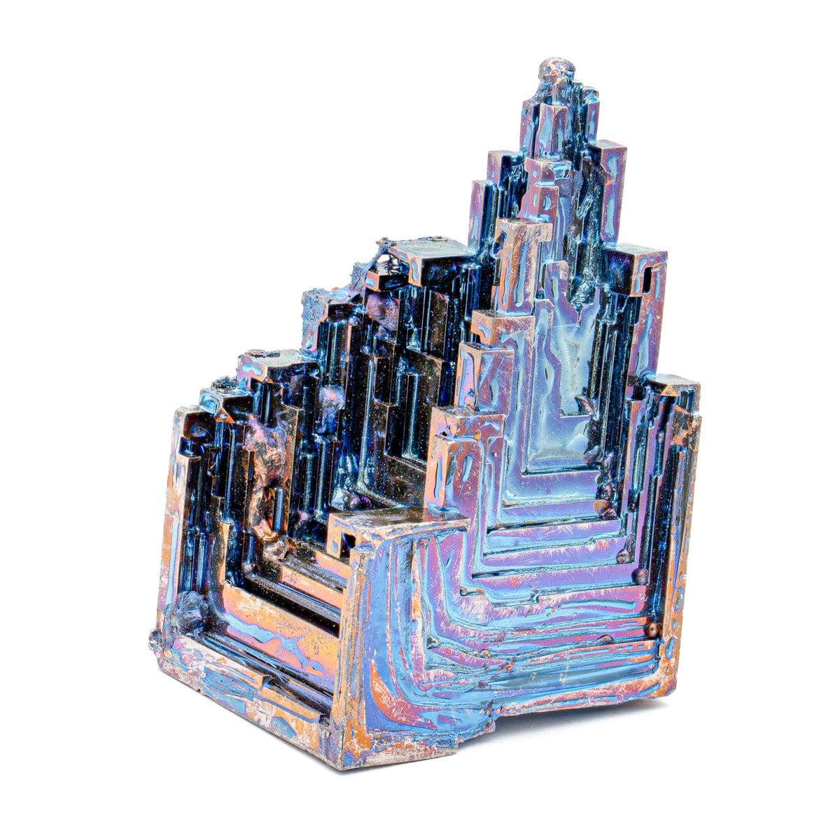 Bismuth is an element (Bi 83) best known for its unusual staircase shape, the result of bismuth atoms attaching to the edge of a rapidly growing crystal. This is called hoppering, when atoms are drawn to the edge of a structure, creating a lattice formation.