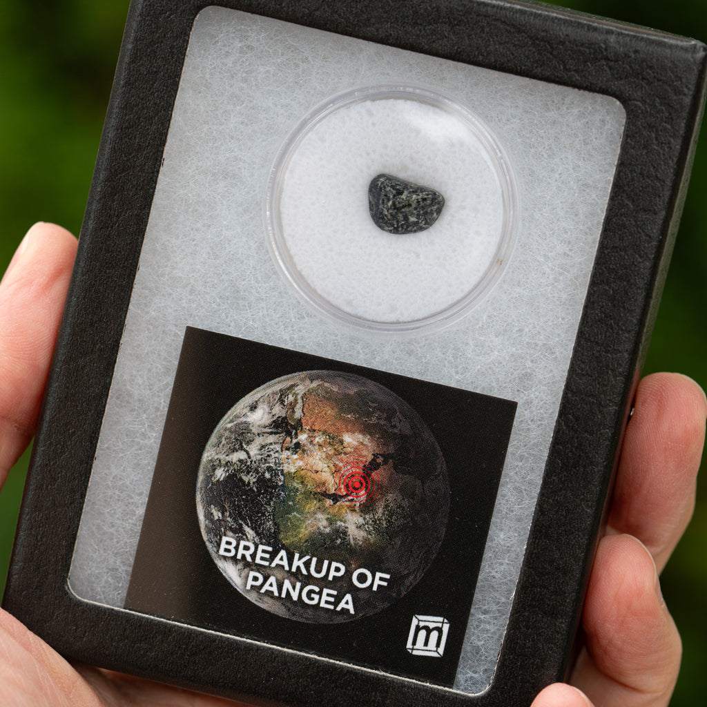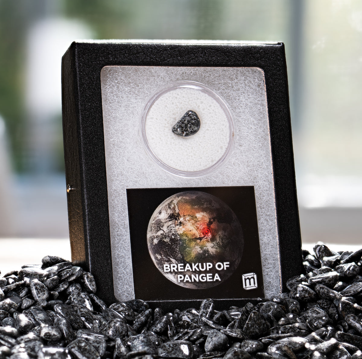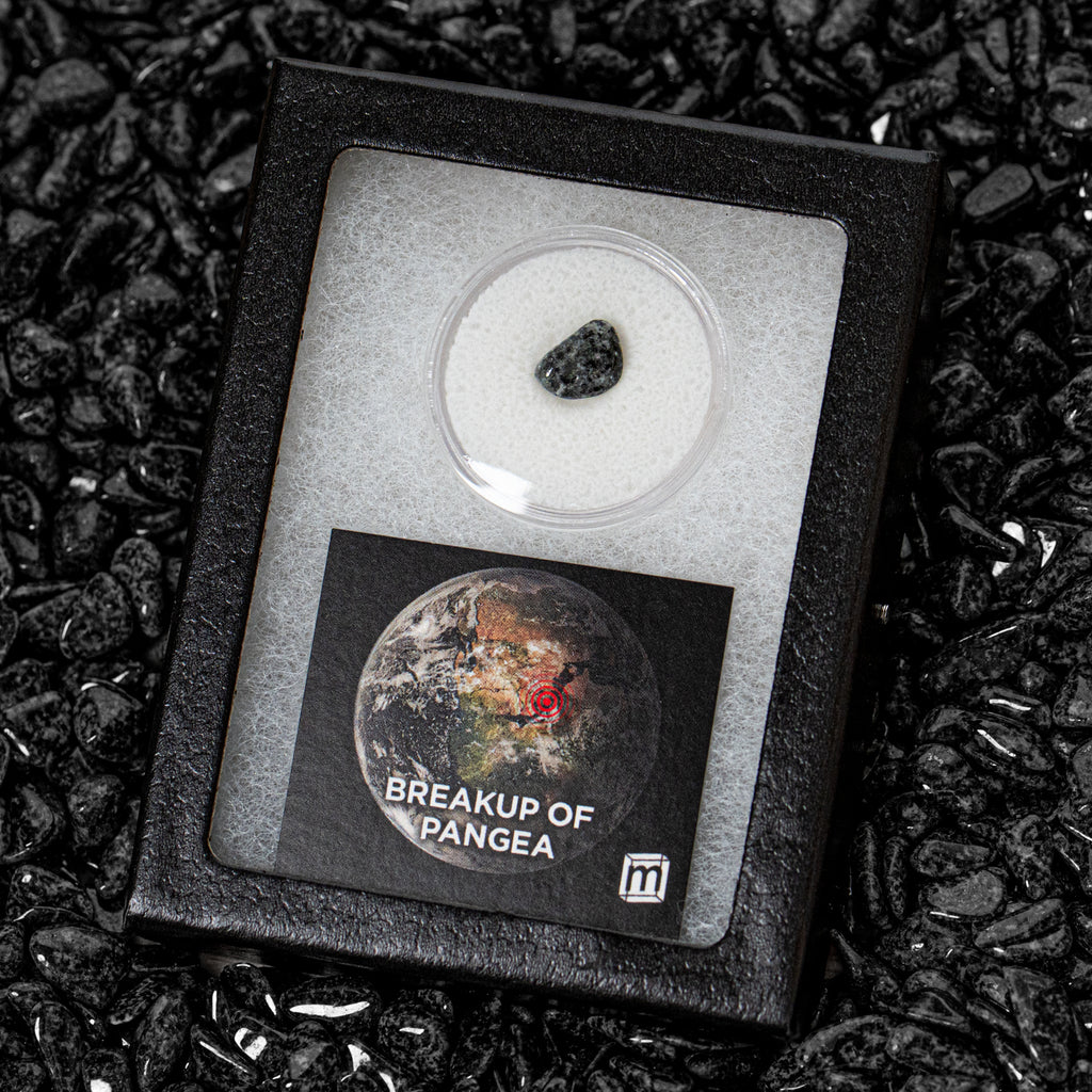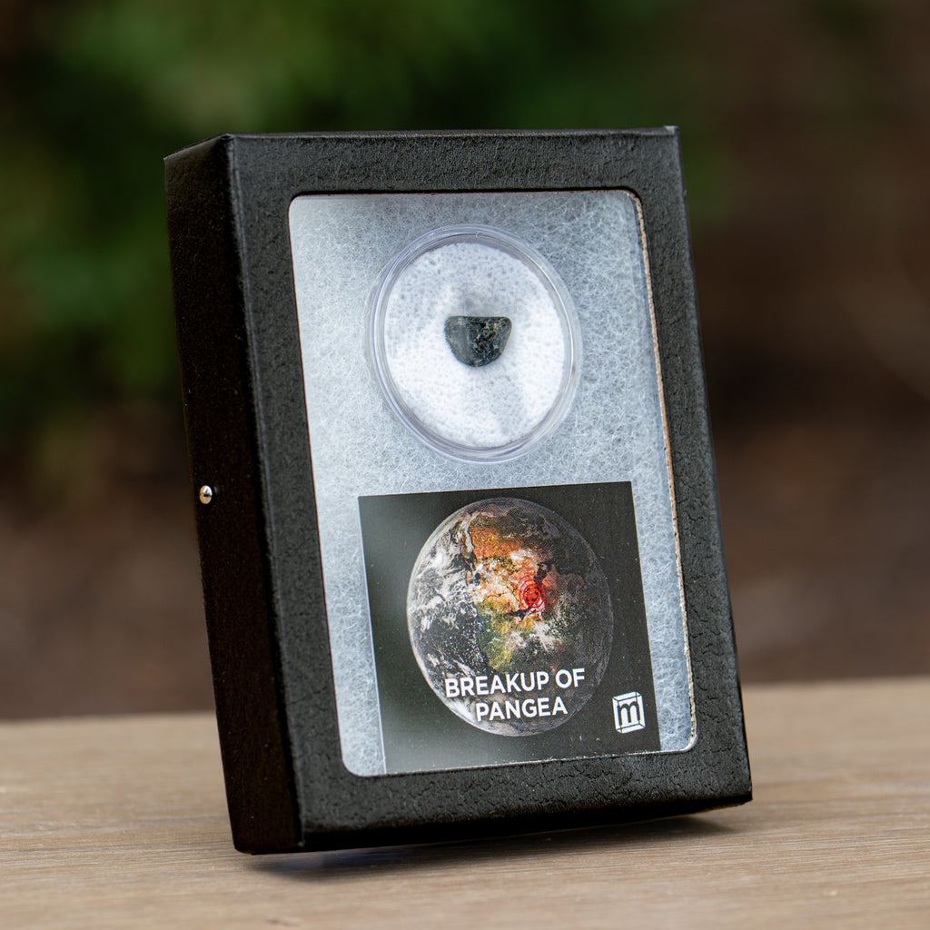 This specimen is a polished diabase fragment from the Central Atlantic Magmatic Province deposits of Eastern North America. Similar to the specimen in the Acrylic version of the Mini Museum, but much larger, the item is encased in an acrylic specimen jar and housed in a glass-topped riker display box measuring 4x3x1 (inches). A small information card will accompany the specimen.
