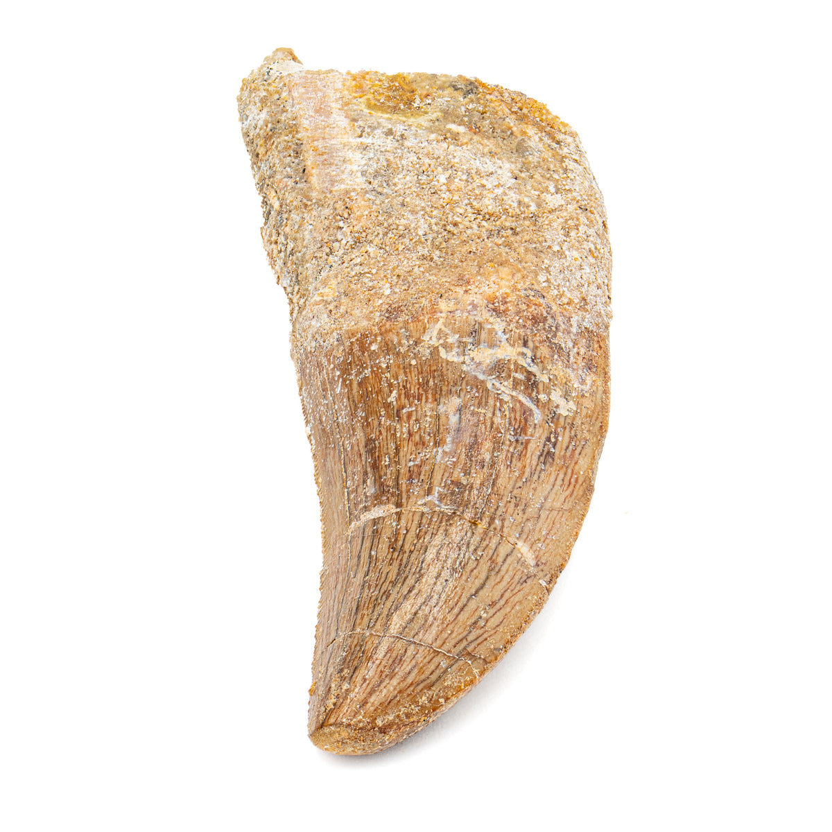 This specimen is a complete crown of a real, fossilized Carcharodontosaurus tooth from the Kem Kem fossil beds of Morocco. The tooth measures 2.50" in length.