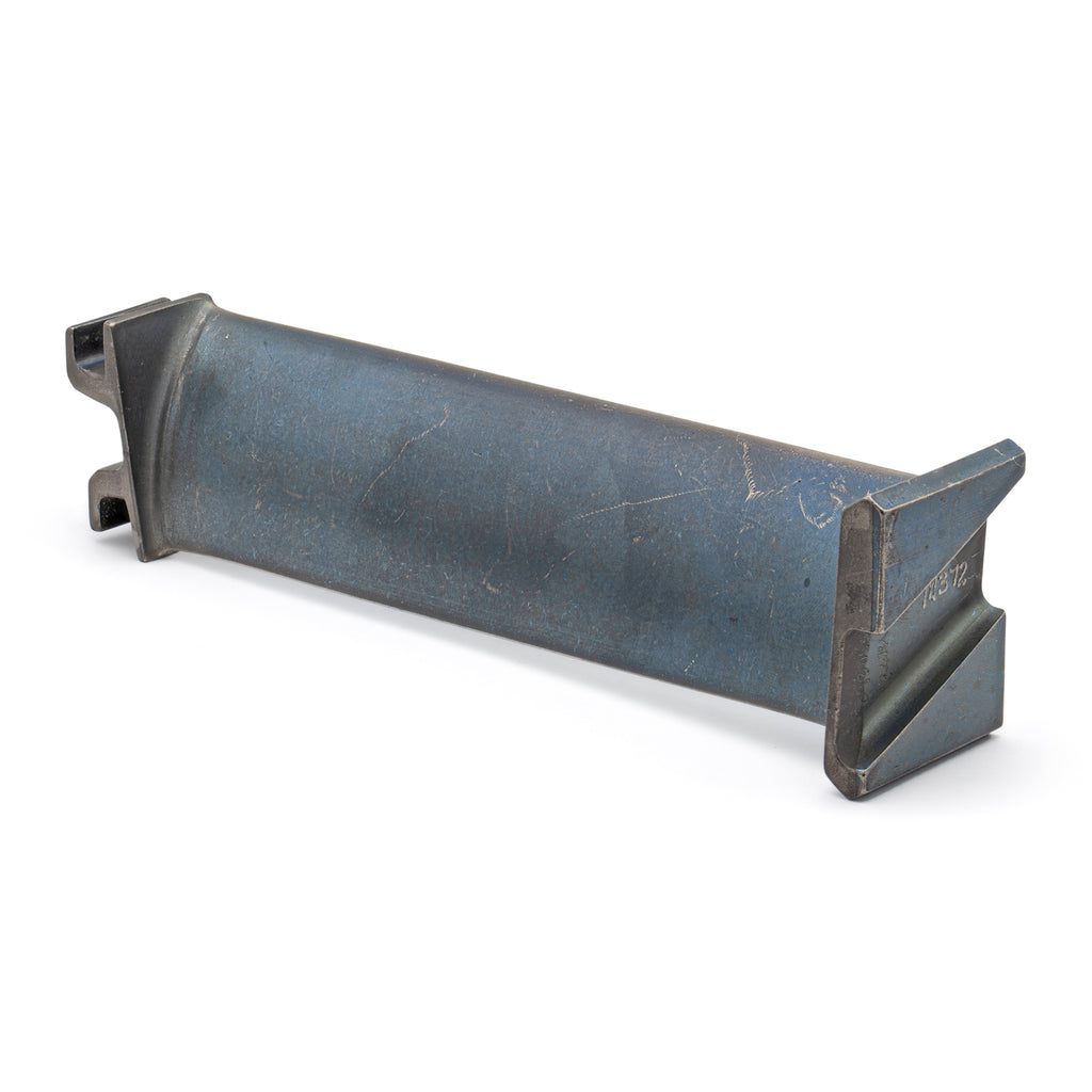 This specimen is a rotor turbine blade taken from the jet engine of a Concorde. The compressor vane, an integral part of the four turbojet engines, allowed the Concorde to cruise above Mach 2. Produced by Britain's Rolls Royce and Snecma Moteurs of France, the Olympus 593 Mk 610 were the most powerful transport certified engines in the world at the time of their introduction.
