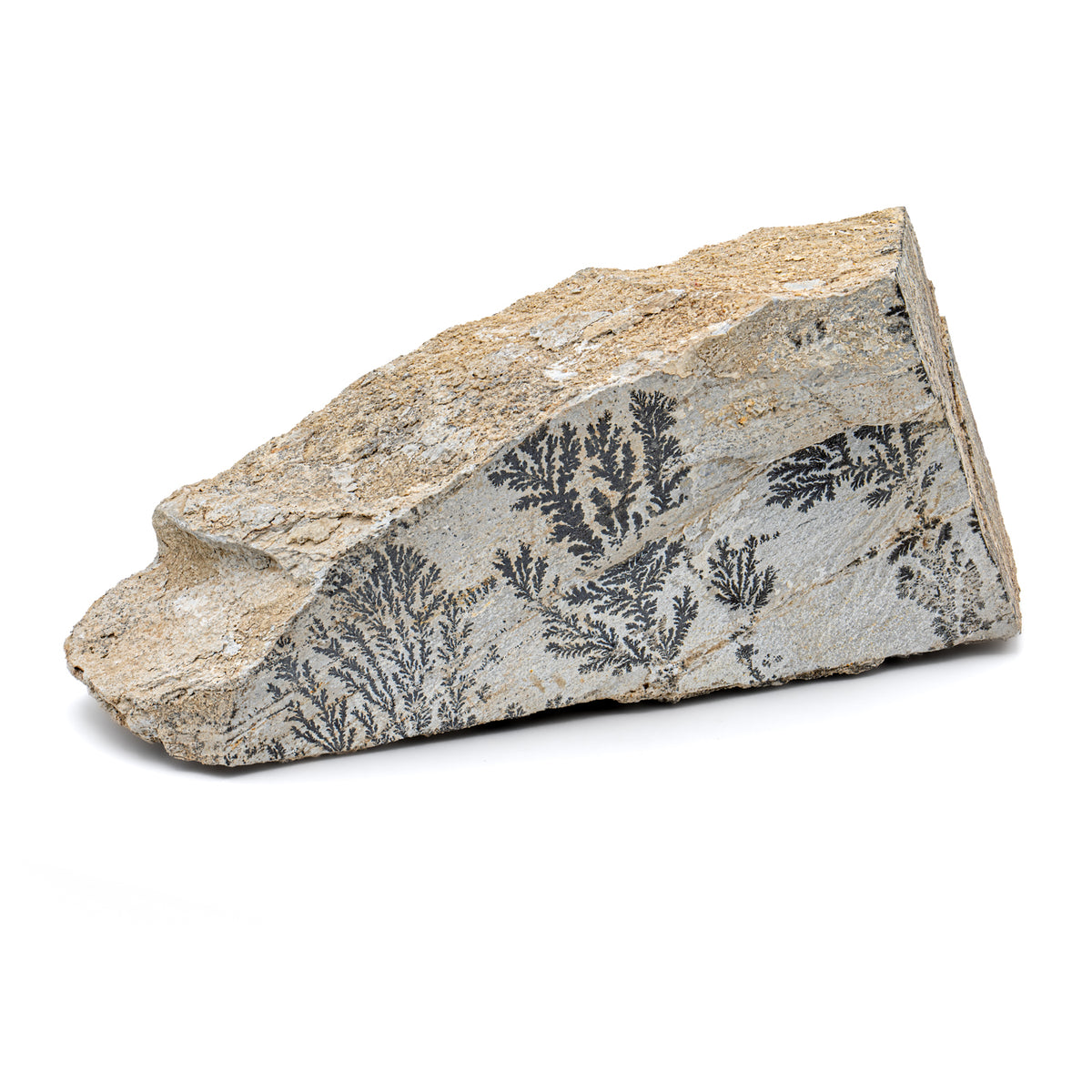 Our collection contains many fossils in a variety of patterns, colors, and ages. This dendrite, however, is not a fossil. Despite its plant-like appearance, it is a completely inorganic crystal formed through natural mechanisms of physics and geochemistry. Commonly mistaken for fossilized plants, dendrites are actually branching patterns of manganese oxide which have crystalized in unique formations.