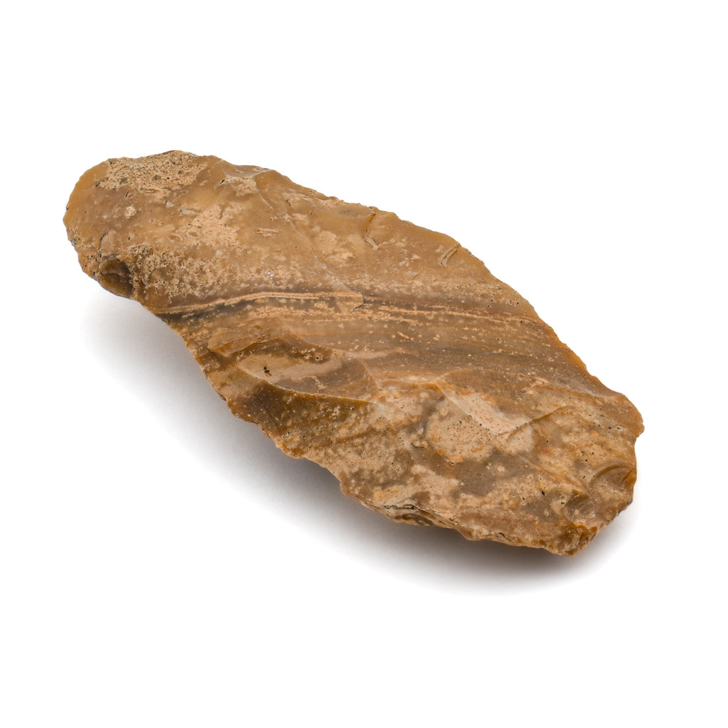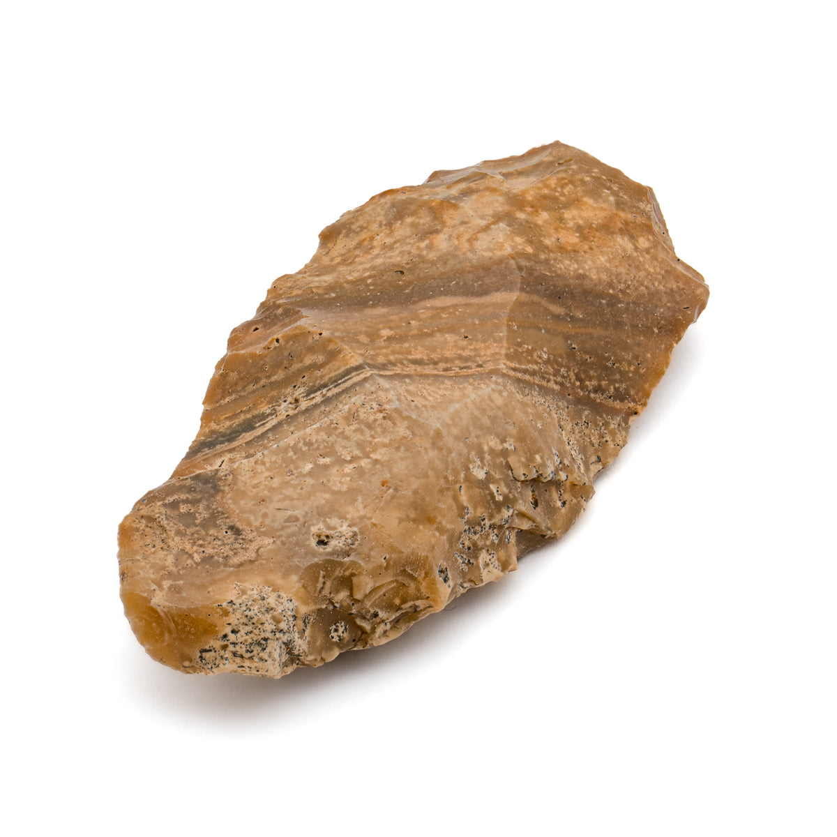 The earliest known tools date back 2,600,000 million years, deep into the Paleolithic and far older than any known human civilization. For the vast majority of human history, the stone tool was the presiding technology of its time. Though styles varied over time, the core method of creating a knapped stone tool remained relatively consistent through the Paleolithic. A starting rock of flint would have one side knapped to a sharp point by beating the edges with a hammerstone or antler. The other half was rounded out, giving the tool an almond look. This allowed it to fit snugly into one’s hand for both comfort and grip.