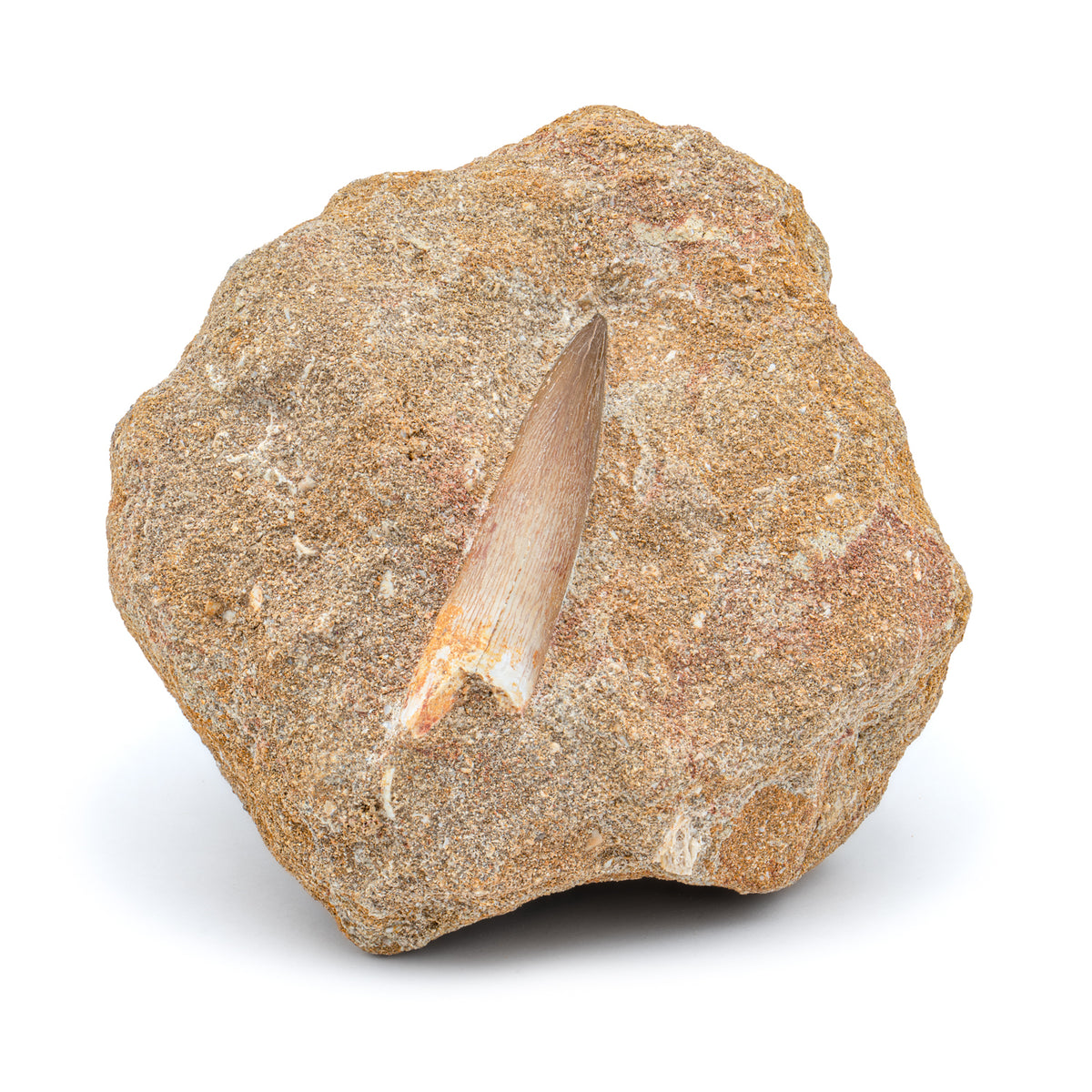 This specimen is a Plesiosaur tooth embedded in matrix. It was recovered from deposits in Morocco and dates to the Late Cretaceous Period.