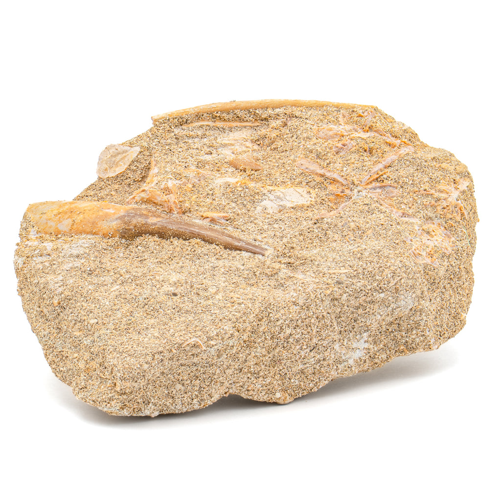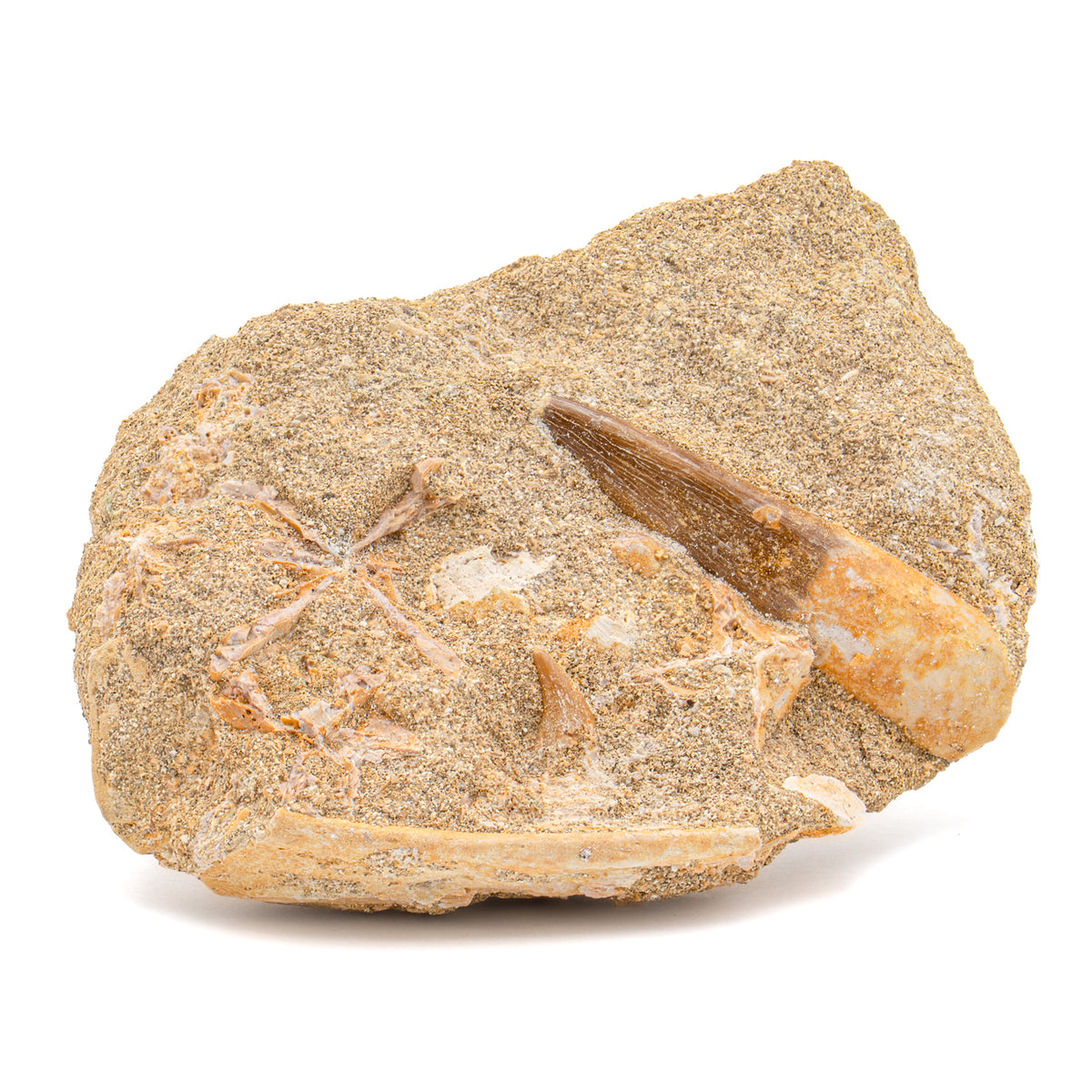 This specimen is a Plesiosaur tooth embedded in matrix. It was recovered from deposits in Morocco and dates to the Late Cretaceous Period.