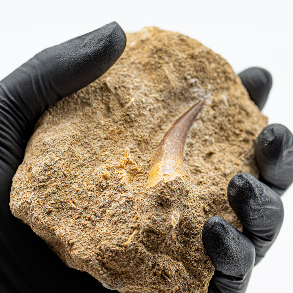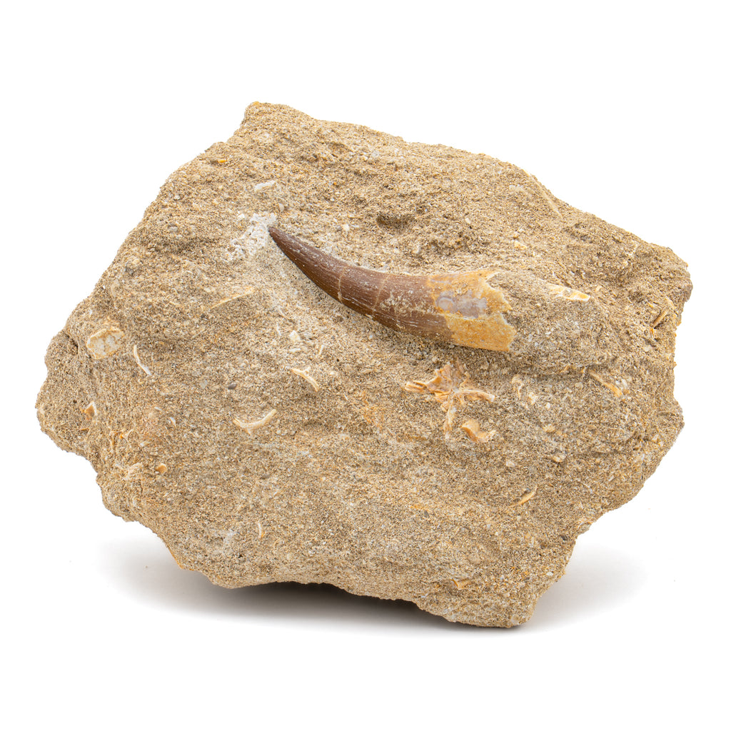 This specimen is a Plesiosaur tooth embedded in matrix. It was recovered from deposits in Morocco and dates to the Late Cretaceous Period.