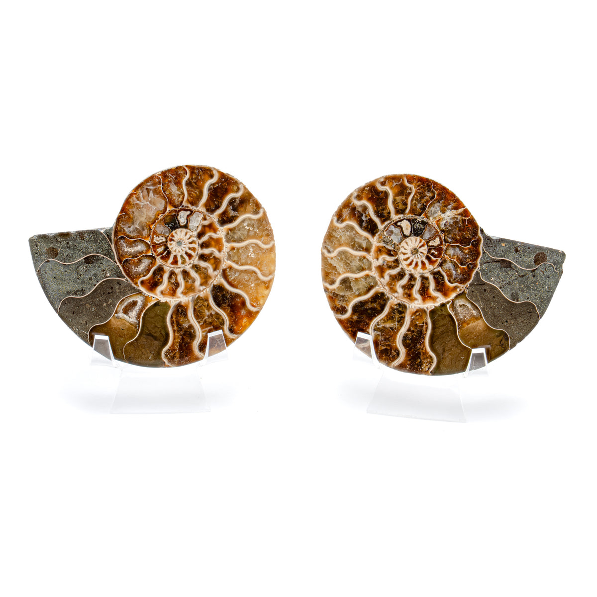 These internal chambers are called septa and the ammonite could fill them with air in order to float through the ocean like a balloon. After millions of years, they are now mineralized with beautiful spiral patterns. A pair of stands and informational card is included the fossil.