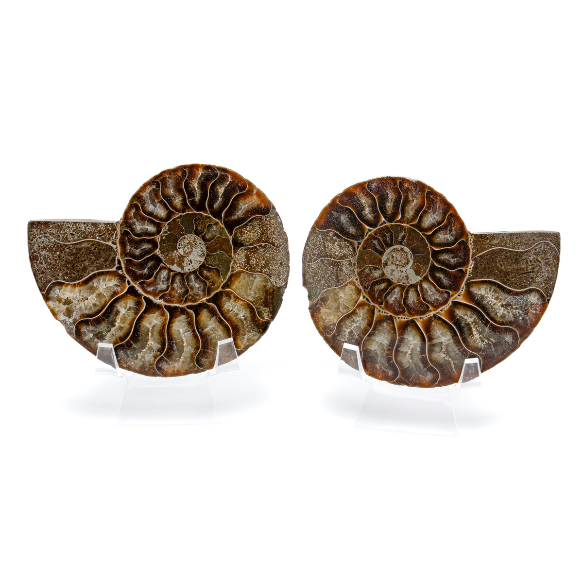 These Split Ammonites are pairs and comes with two stands for display. A small informational card that serves as certificate of authenticity is also included.