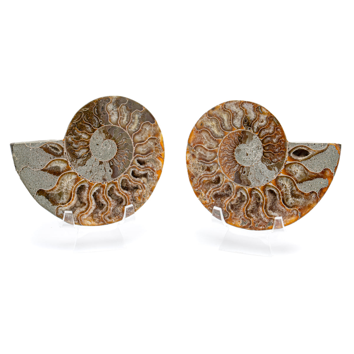 These Split Ammonites are pairs and comes with two stands for display. A small informational card that serves as certificate of authenticity is also included.