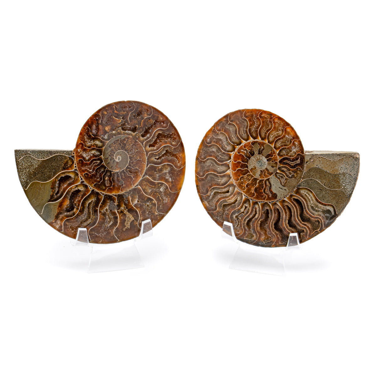 These Split Ammonites are pairs and comes with two stands for display. A small informational card that serves as certificate of authenticity is also included.