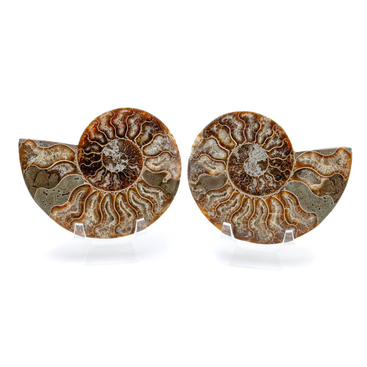 These internal chambers are called septa and the ammonite could fill them with air in order to float through the ocean like a balloon. After millions of years, they are now mineralized with beautiful spiral patterns. A pair of stands and informational card is included the fossil.