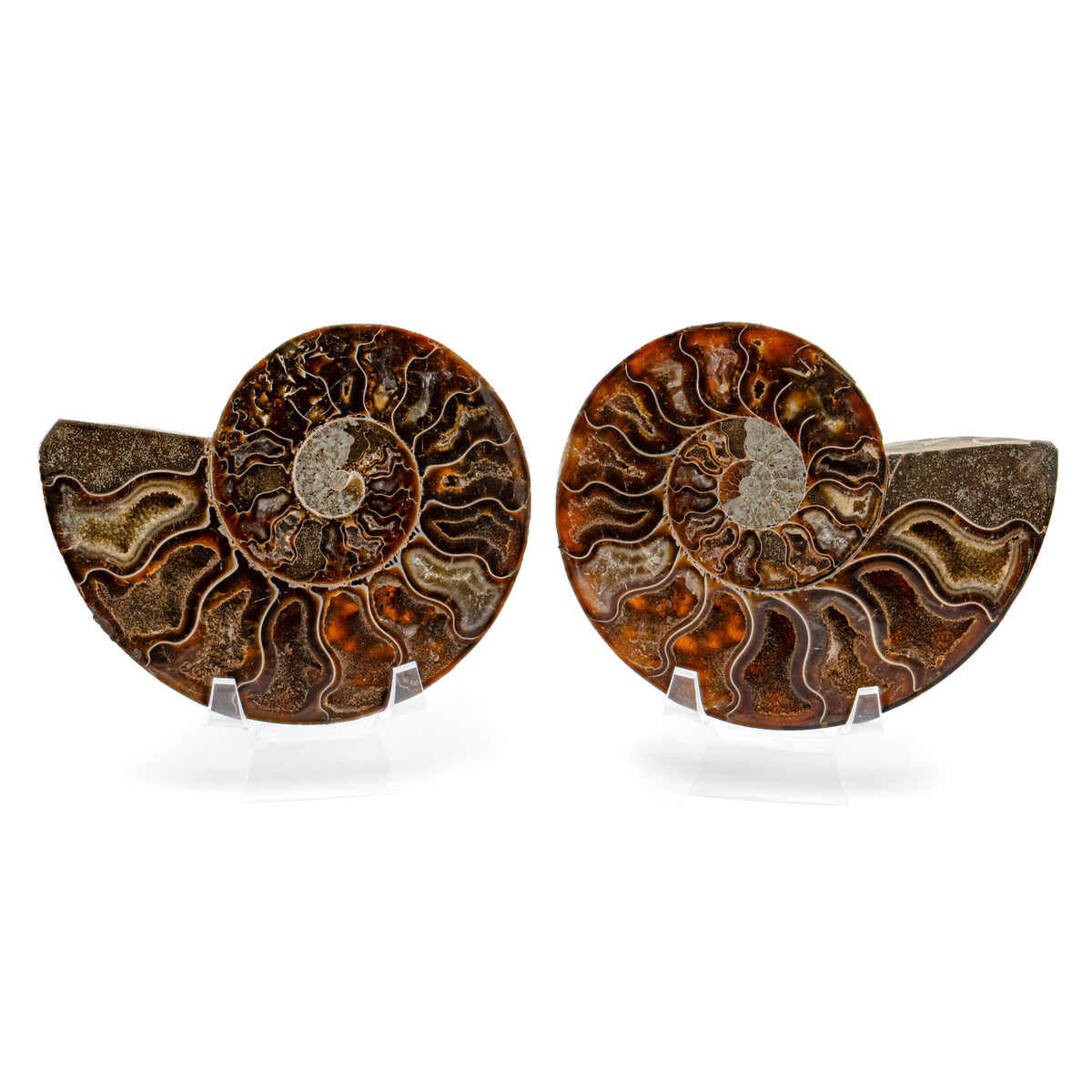 Ammonites are an extinct group of cephalopods that entered the fossil record 400 million years ago. This specimen is a 4.789" polished Cleoniceras fossil from Madagascar. The fossil has been split into a paired set to showcase the beautiful internal chambers of the shell.