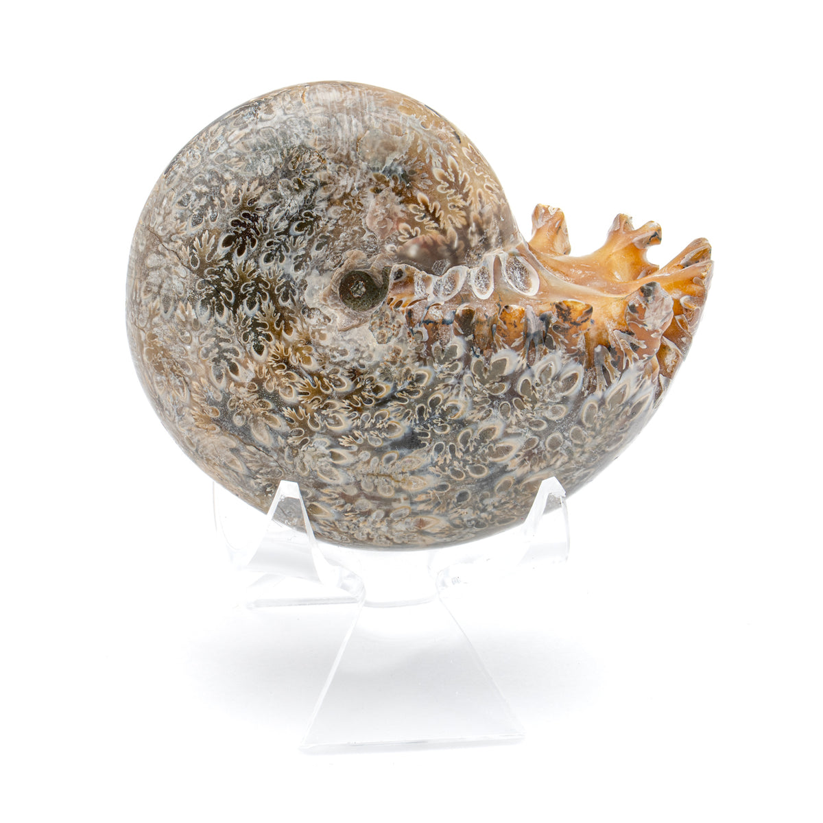 Each Sutured Ammonite is sold individually and comes with a stand for display. A small informational card that serves as certificate of authenticity is also included.