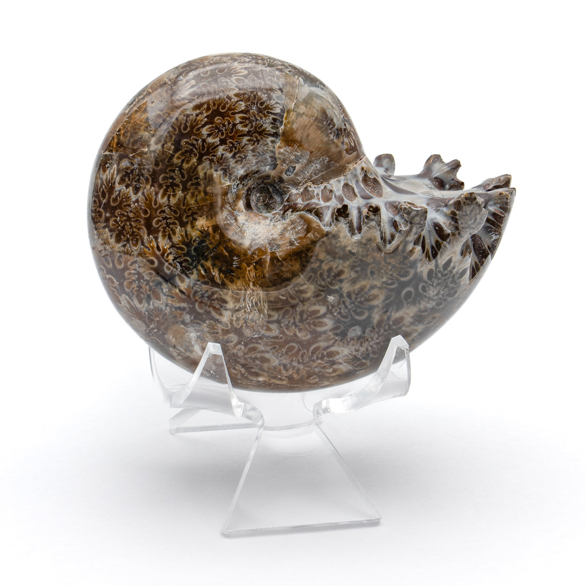 This particular genus of ammonite had beautiful suture patterns that cross their shells like feathered jigsaw pieces and make fantastic display pieces. A stand and informational card is included with each fossil.