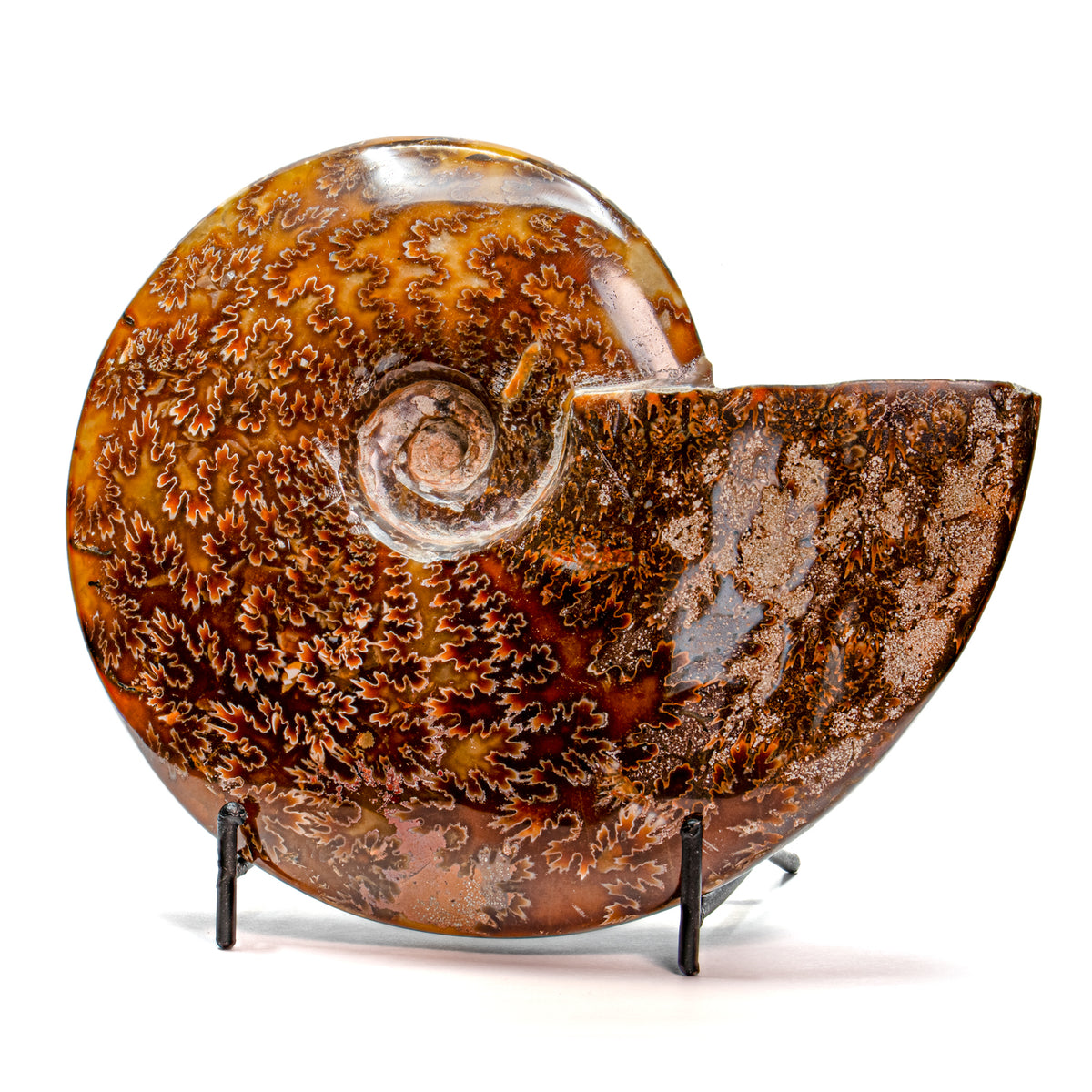 These ammonites are quite large and the perfect size to hold in your hand. Their polishing makes them smooth to the touch and shows a broad range of colors as you turn it in the light. This polishing also shows the intricate jigsaw pattern across the fossil. They will delight any visitor and are perfect for display in every setting.