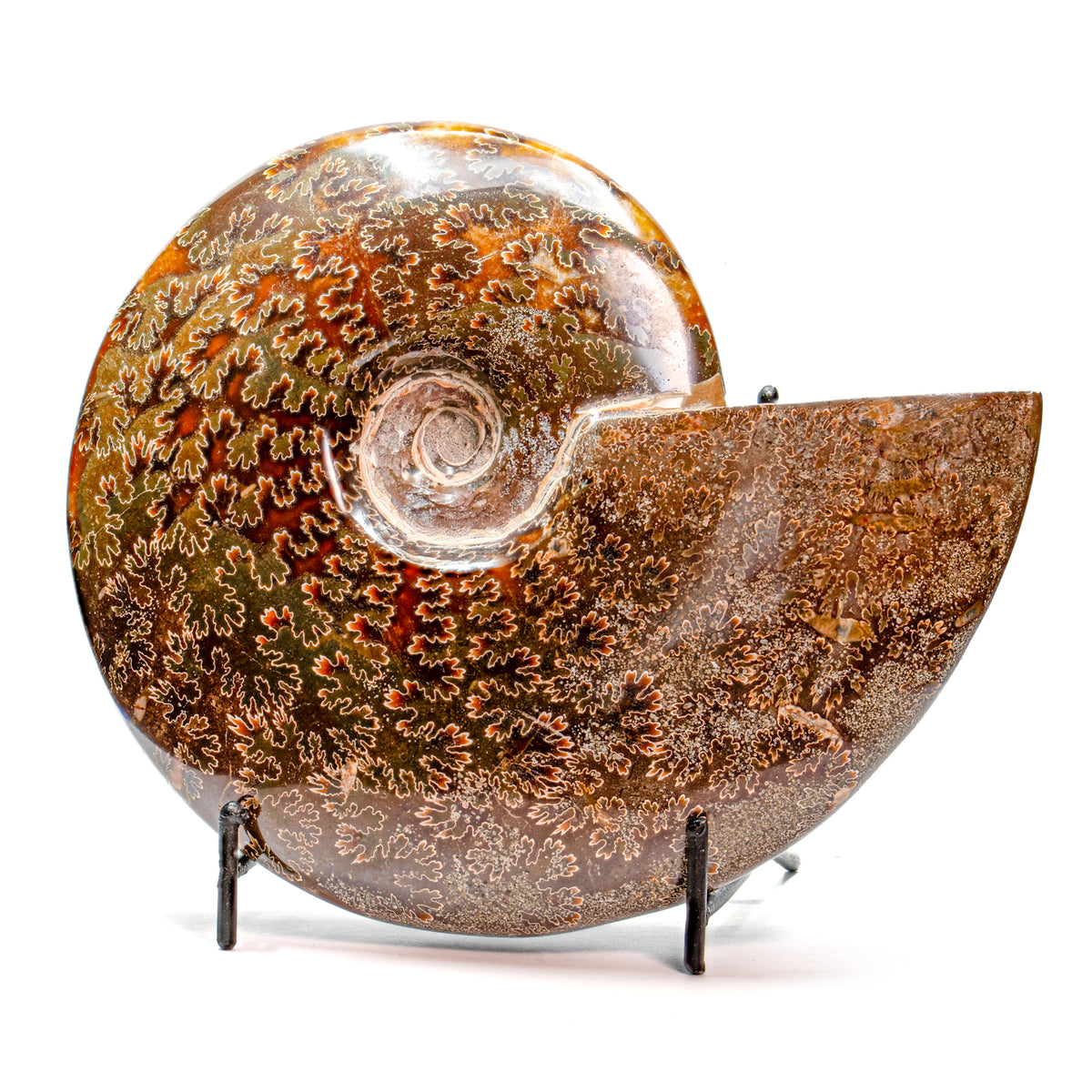 These ammonites are quite large and the perfect size to hold in your hand. Their polishing makes them smooth to the touch and shows a broad range of colors as you turn it in the light. This polishing also shows the intricate jigsaw pattern across the fossil. They will delight any visitor and are perfect for display in every setting.