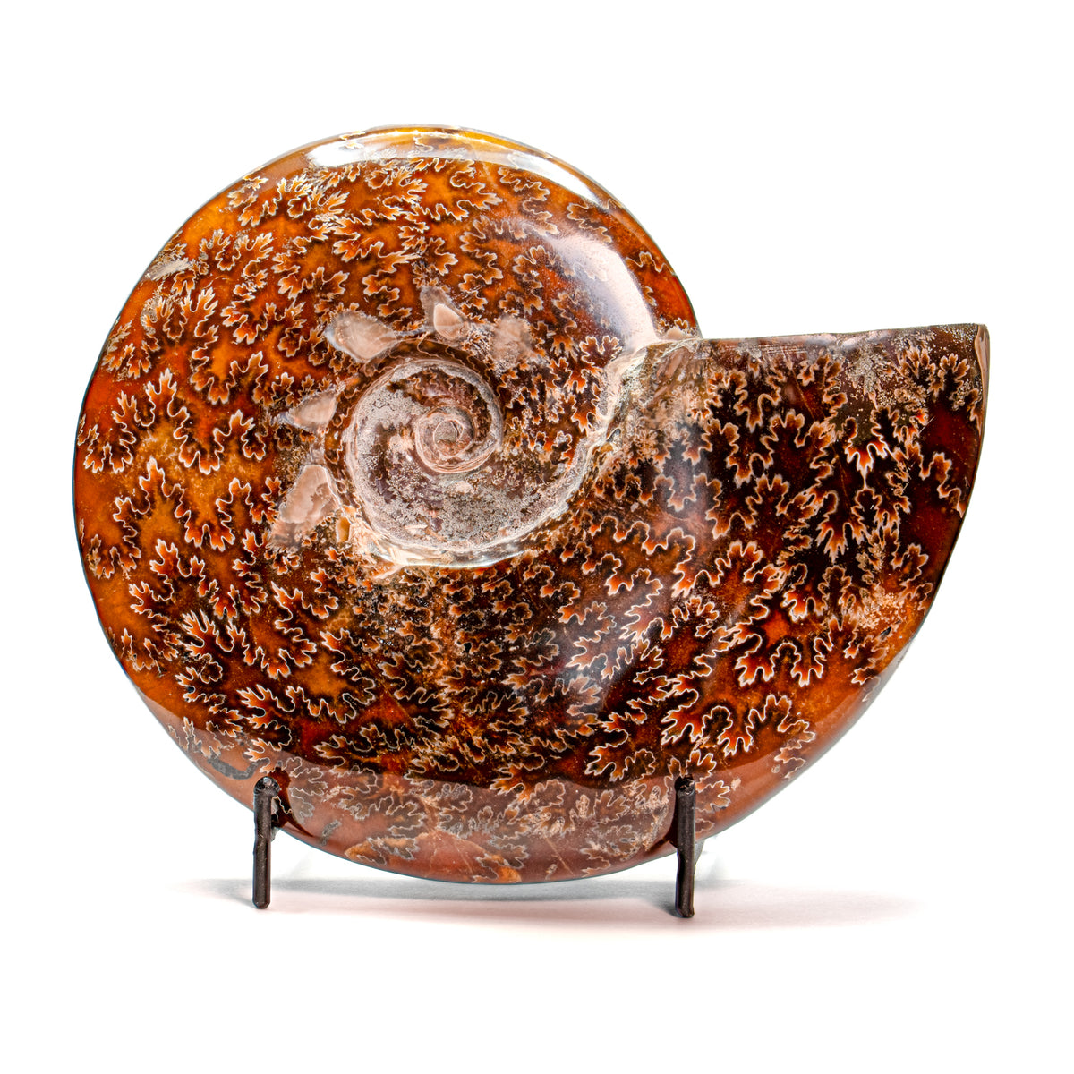 Ammonites are an extinct group of cephalopods that entered the fossil record 400 million years ago. This specimen is a 7.04" polished Cleoniceras fossil from Madagascar.