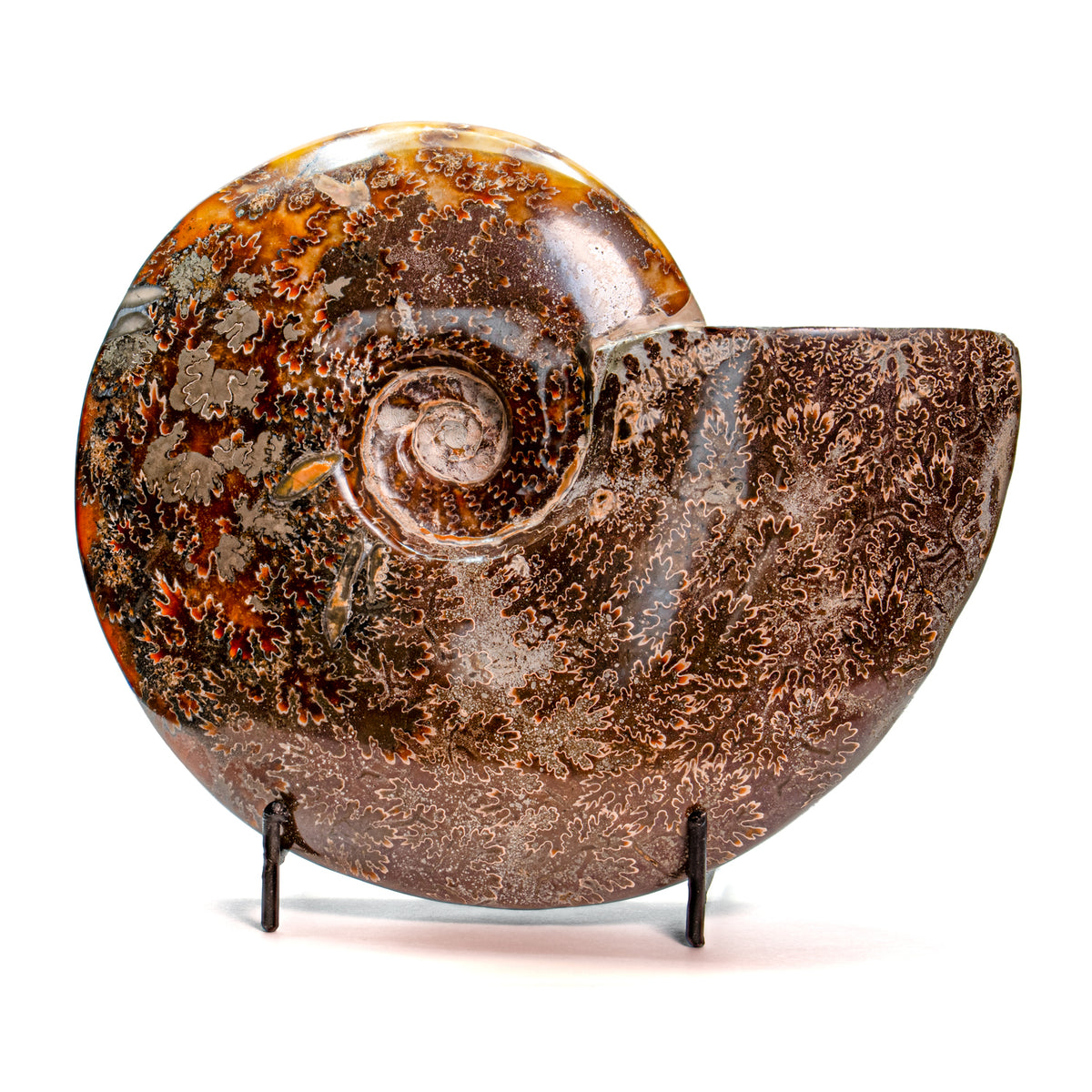 Ammonites are an extinct group of cephalopods that entered the fossil record 400 million years ago. This specimen is a 7.17" polished Cleoniceras fossil from Madagascar.