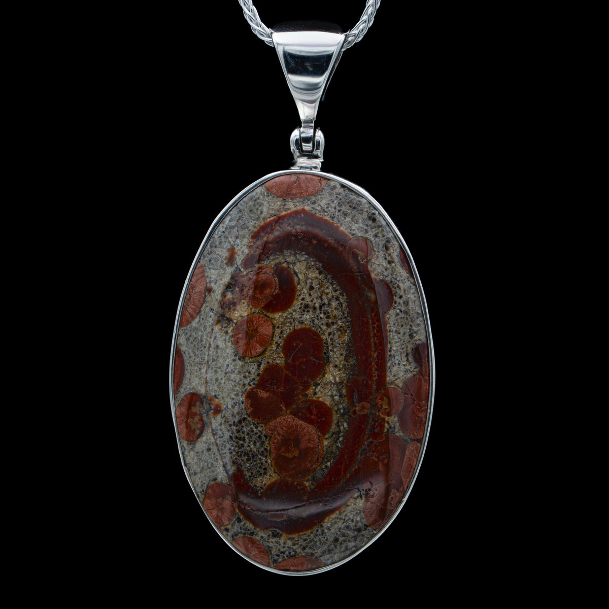 This pendant contains a polished 1.38" sample of Red Planet Obsidian set into a sterling silver bezel. It comes with an 18" silver chain in a padded black jewelry box.