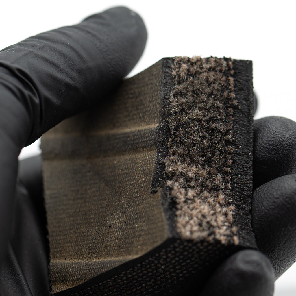 This specimen is a 1.809" mission-flown nose landing gear tire fragment from the Space Shuttle Columbia (OV-102). Serial number verification against public information indicates the tire was removed from service after Columbia's 13th mission (STS-52).