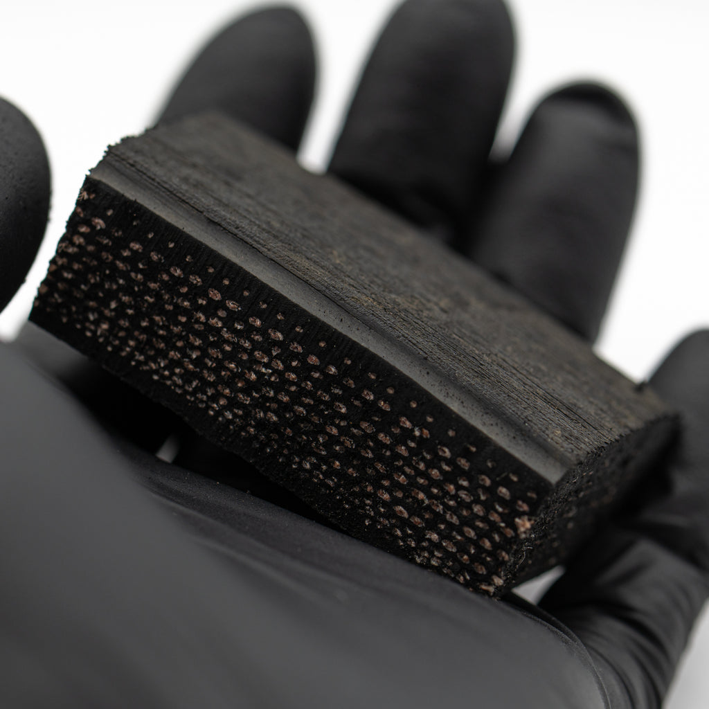 This specimen is a 2.132" mission-flown nose landing gear tire fragment from the Space Shuttle Columbia (OV-102). Serial number verification against public information indicates the tire was removed from service after Columbia's 13th mission (STS-52). This piece includes skid marks from the touchdown of the Space Shuttle during landing.