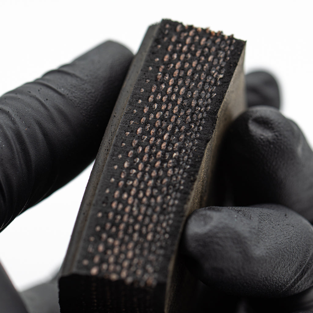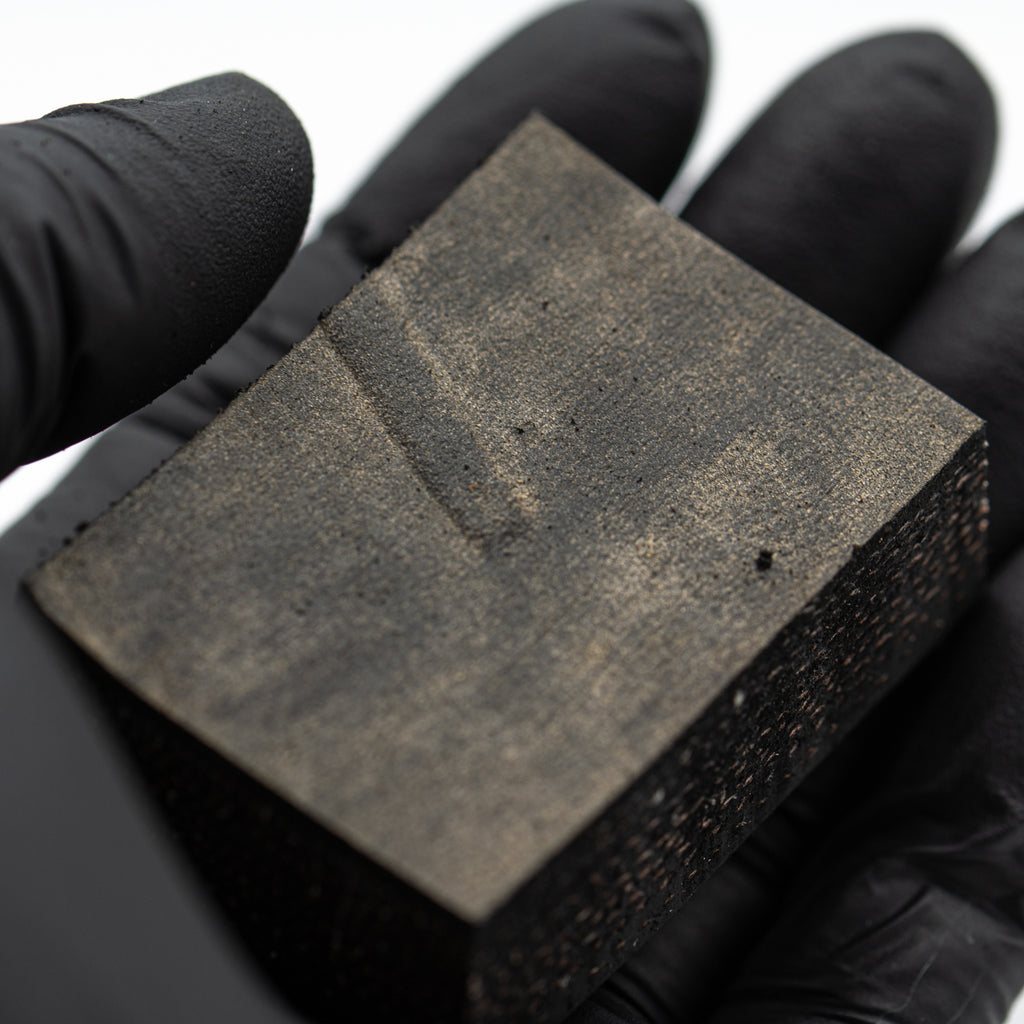 This specimen is a 2.135" mission-flown nose landing gear tire fragment from the Space Shuttle Columbia (OV-102). Serial number verification against public information indicates the tire was removed from service after Columbia's 13th mission (STS-52). This piece includes skid marks from the touchdown of the Space Shuttle during landing.