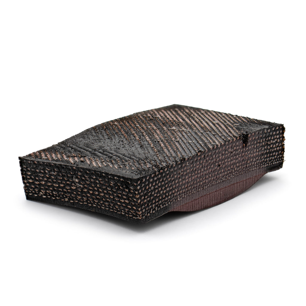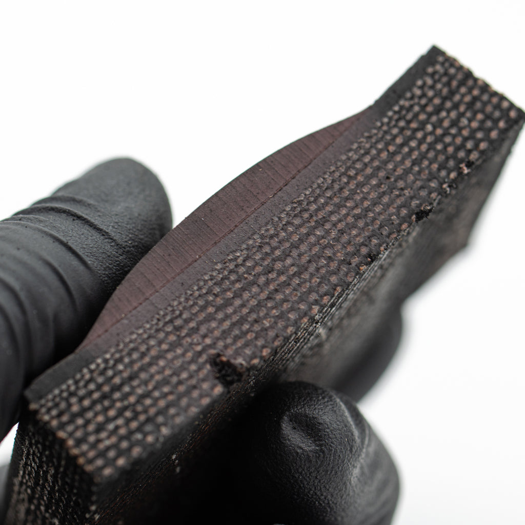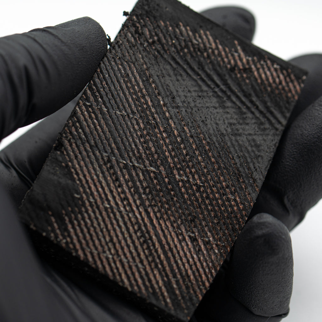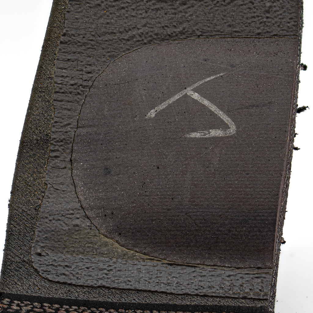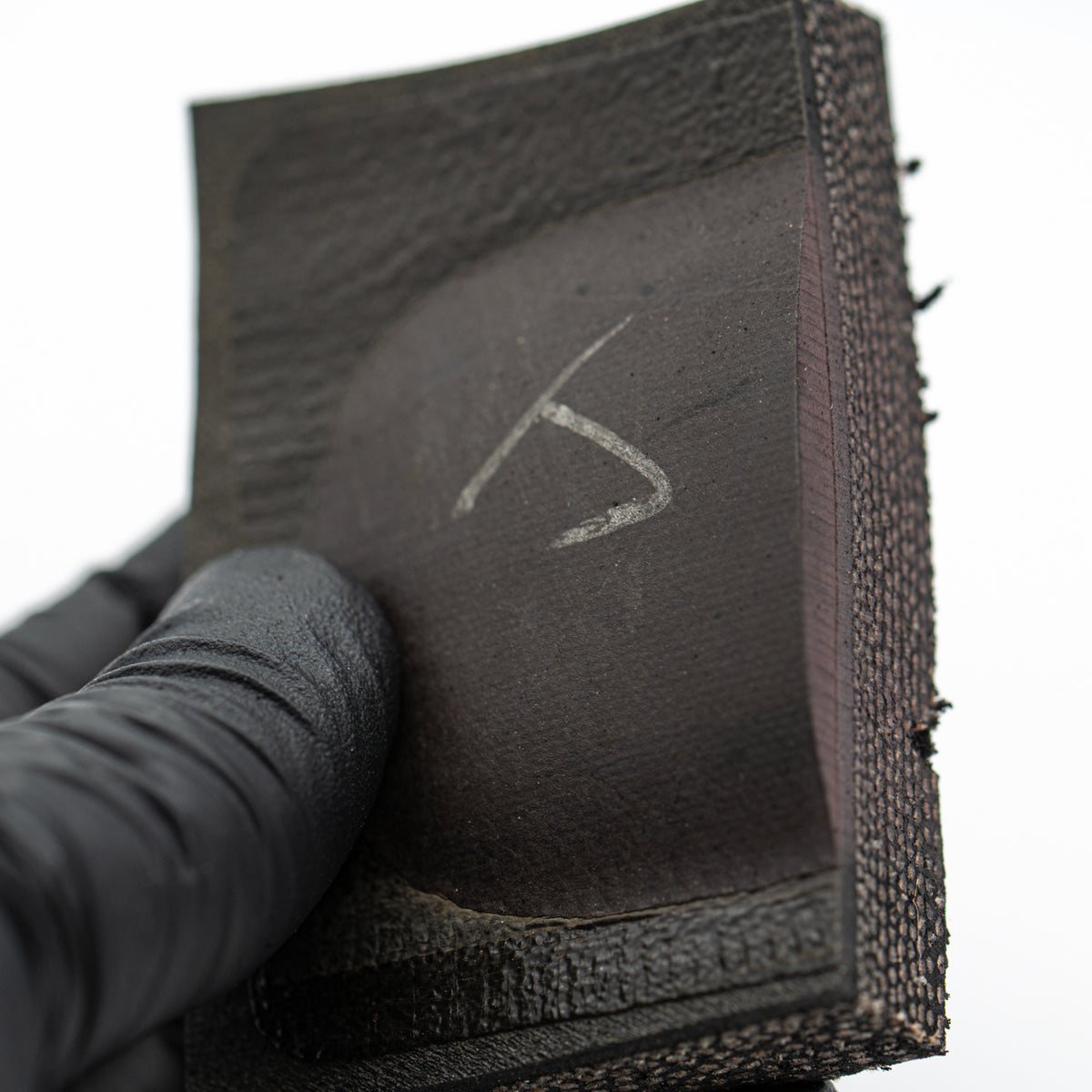 This specimen is a 2.544" mission-flown nose landing gear tire fragment from the Space Shuttle Columbia (OV-102). Serial number verification against public information indicates the tire was removed from service after Columbia's 13th mission (STS-52). Some sections of the tire were thickened with additional rubber to provide protection against fatigue cracks. That material is visible on the exterior side of this tire section.