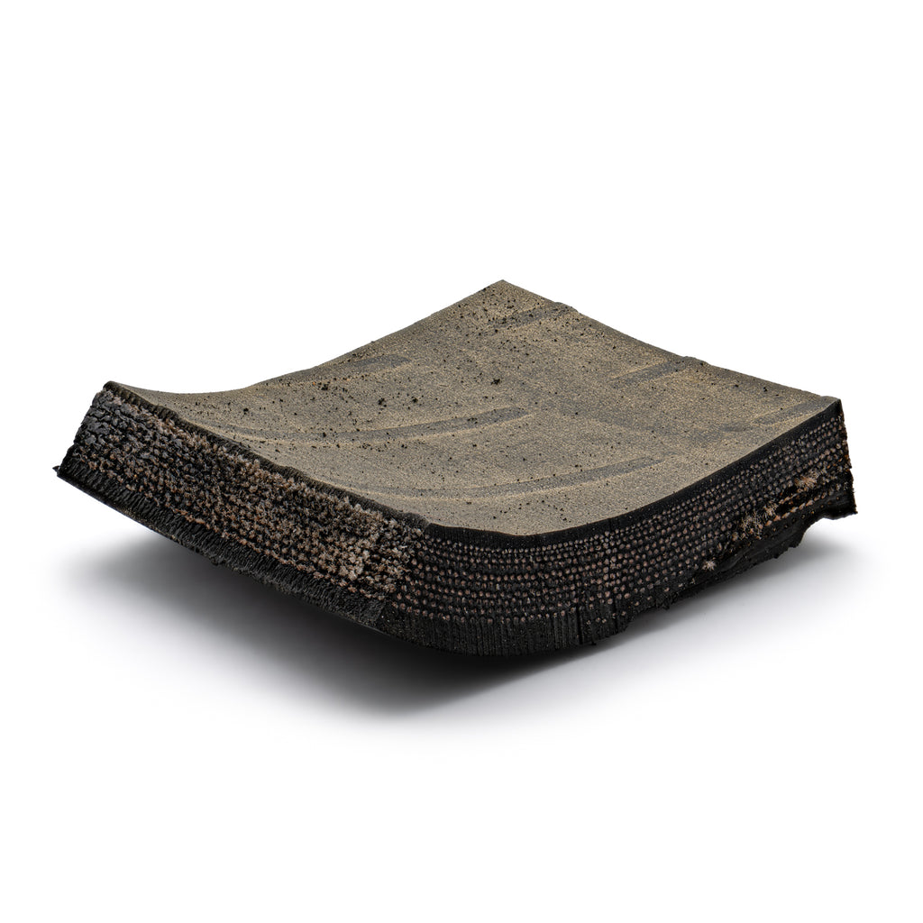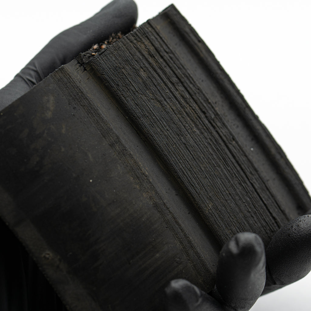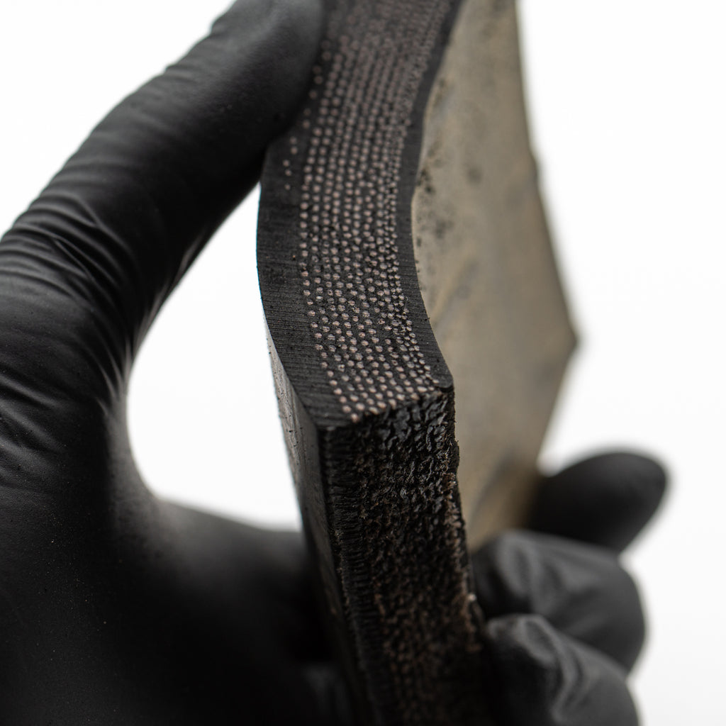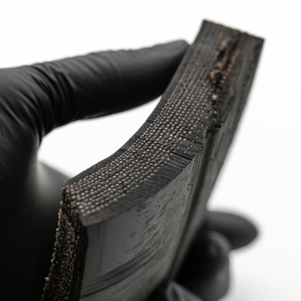 This specimen is a 3.795" mission-flown nose landing gear tire fragment from the Space Shuttle Columbia (OV-102). Serial number verification against public information indicates the tire was removed from service after Columbia's 13th mission (STS-52). This piece includes skid marks from the touchdown of the Space Shuttle during landing.