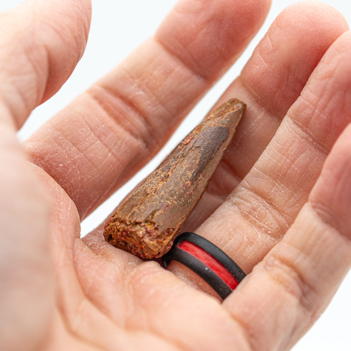 This specimen is a naturally worn, fossilized crown and partial root of a real Spinosaurus tooth from the Kem Kem fossil beds of Morocco. It measures 1.467" in length.