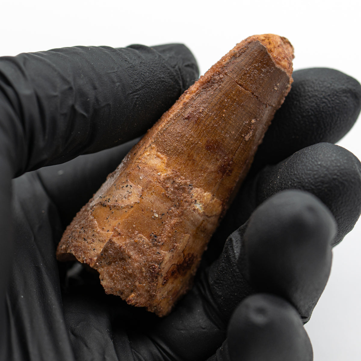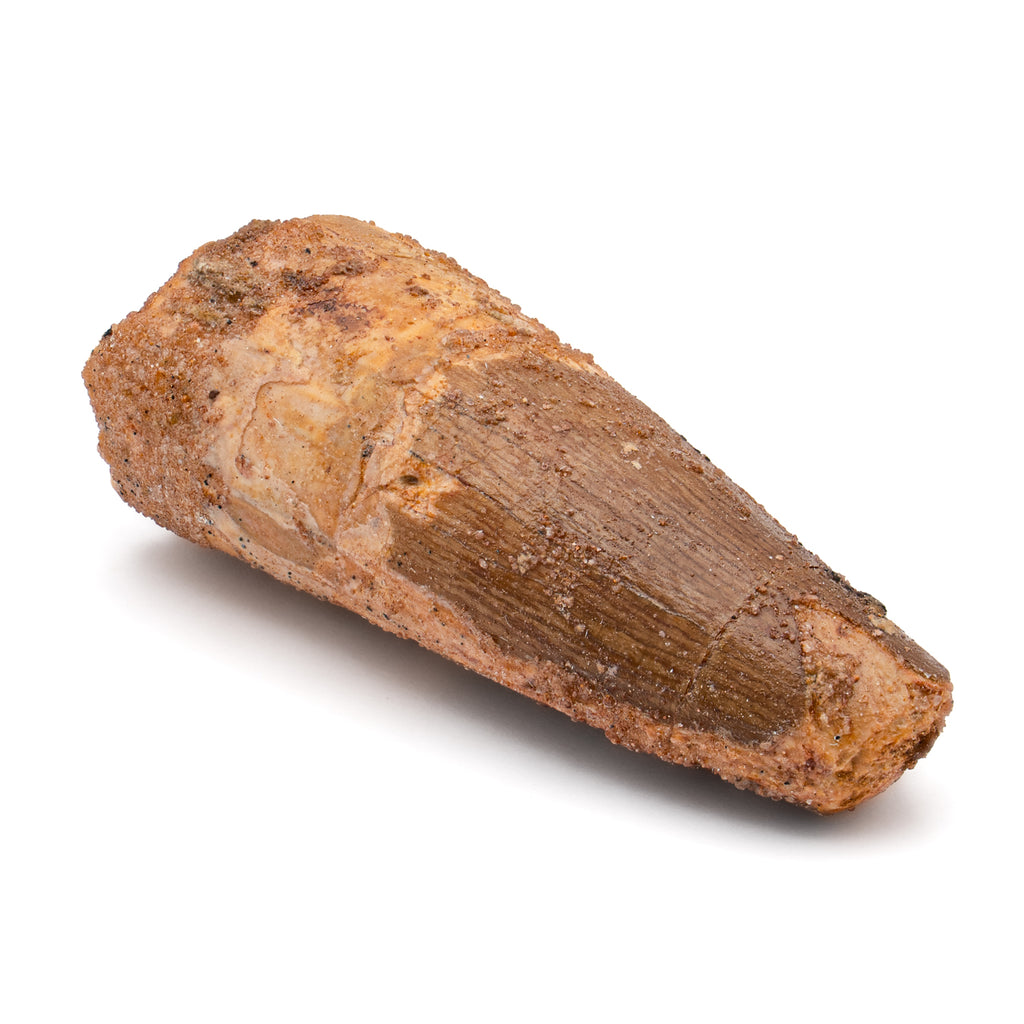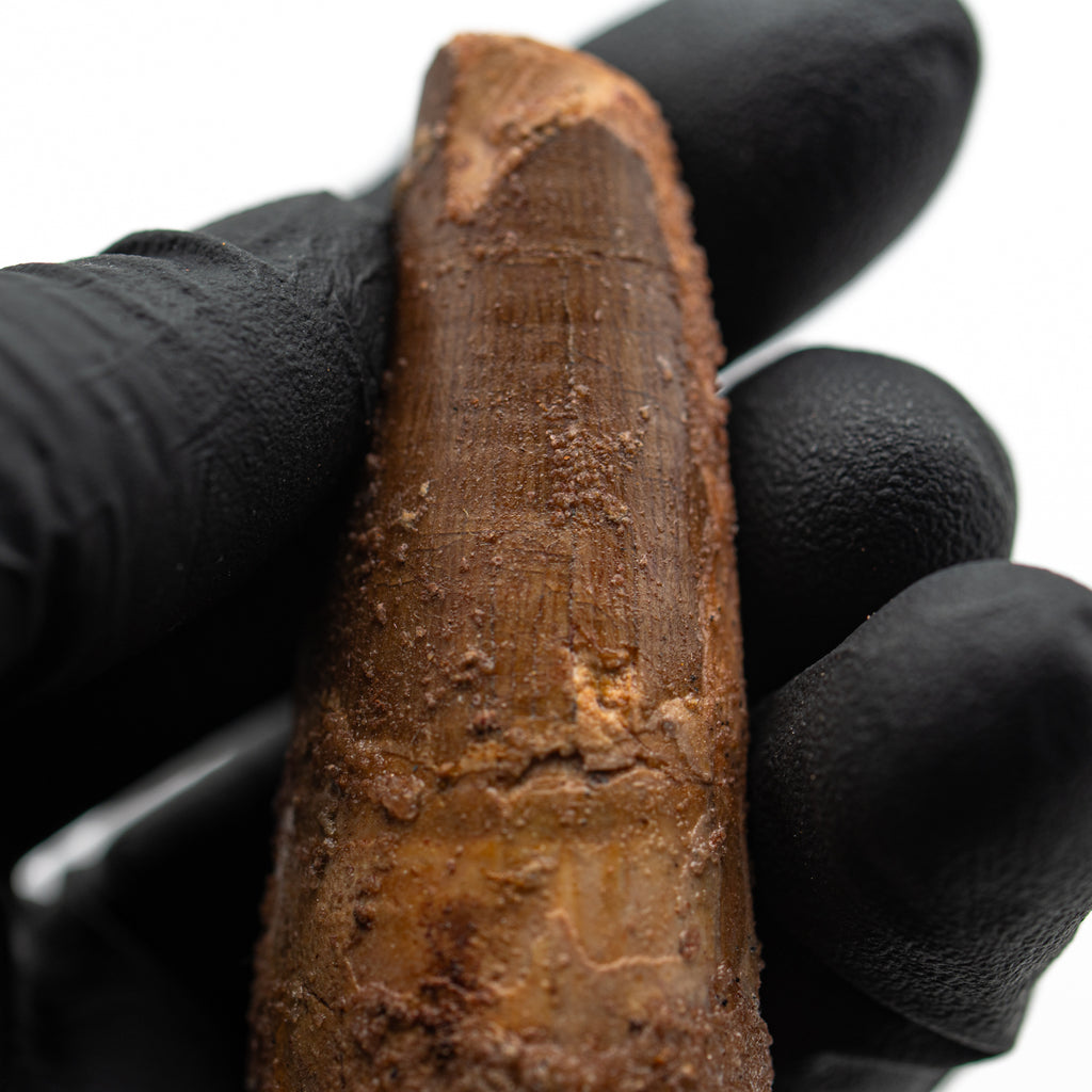 This specimen is a naturally worn, fossilized crown and partial root of a real Spinosaurus tooth from the Kem Kem fossil beds of Morocco. It measures 2.235" in length.