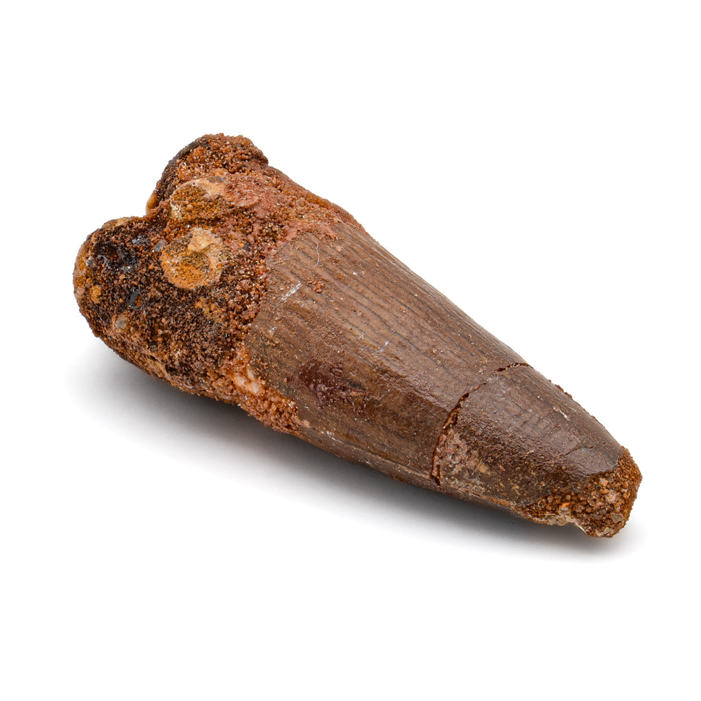 This specimen is a naturally worn, fossilized crown and partial root of a real Spinosaurus tooth from the Kem Kem fossil beds of Morocco. It measures 2.343" in length.