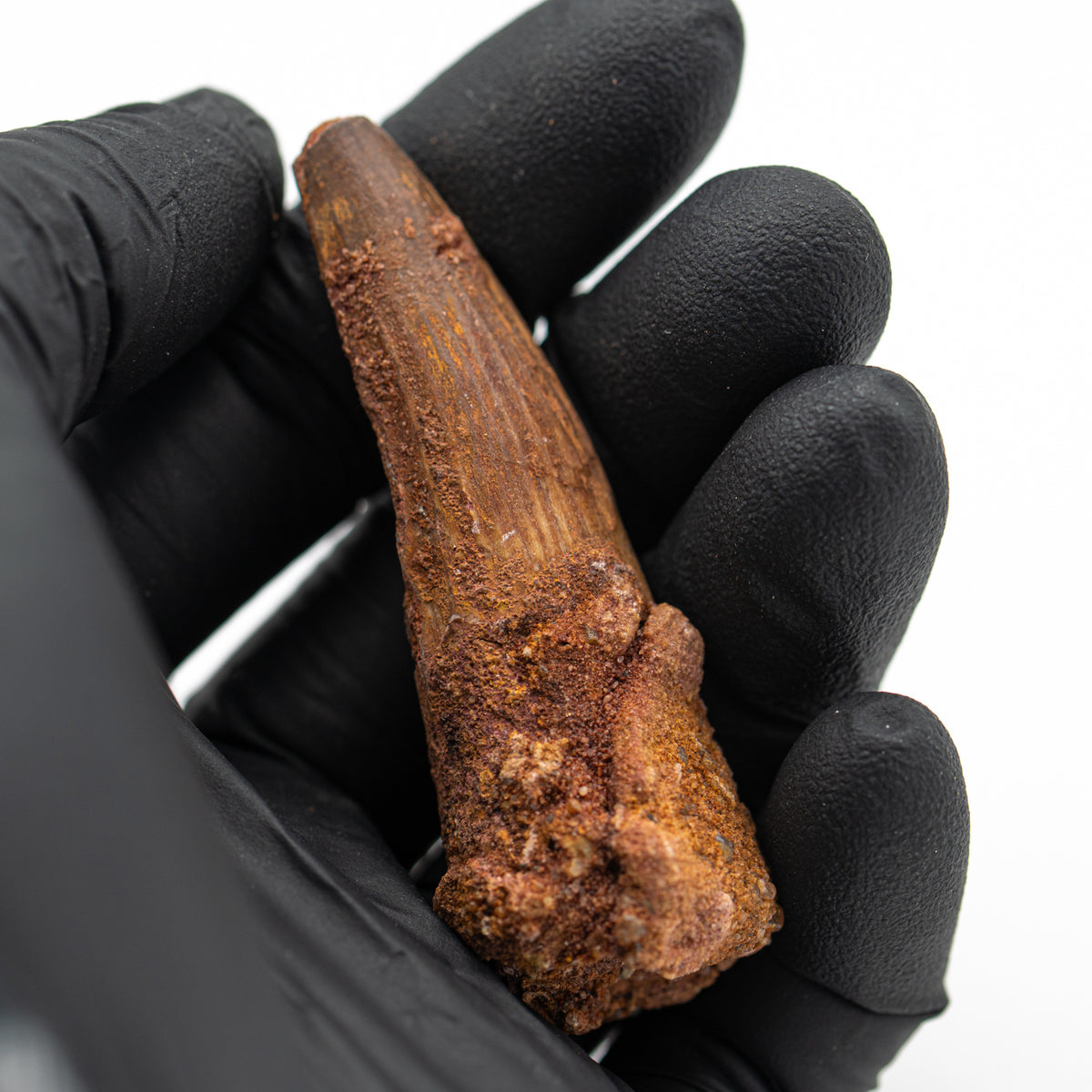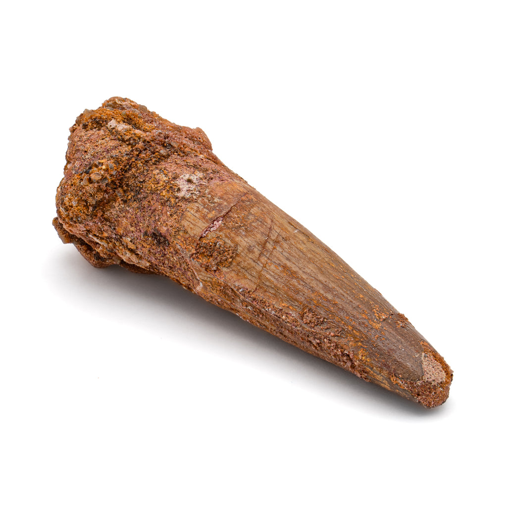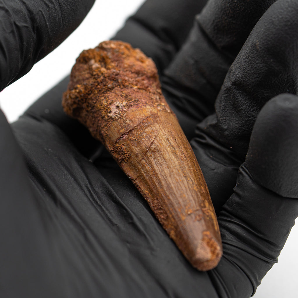 This specimen is a naturally worn, fossilized crown and partial root of a real Spinosaurus tooth from the Kem Kem fossil beds of Morocco. It measures 2.475" in length.