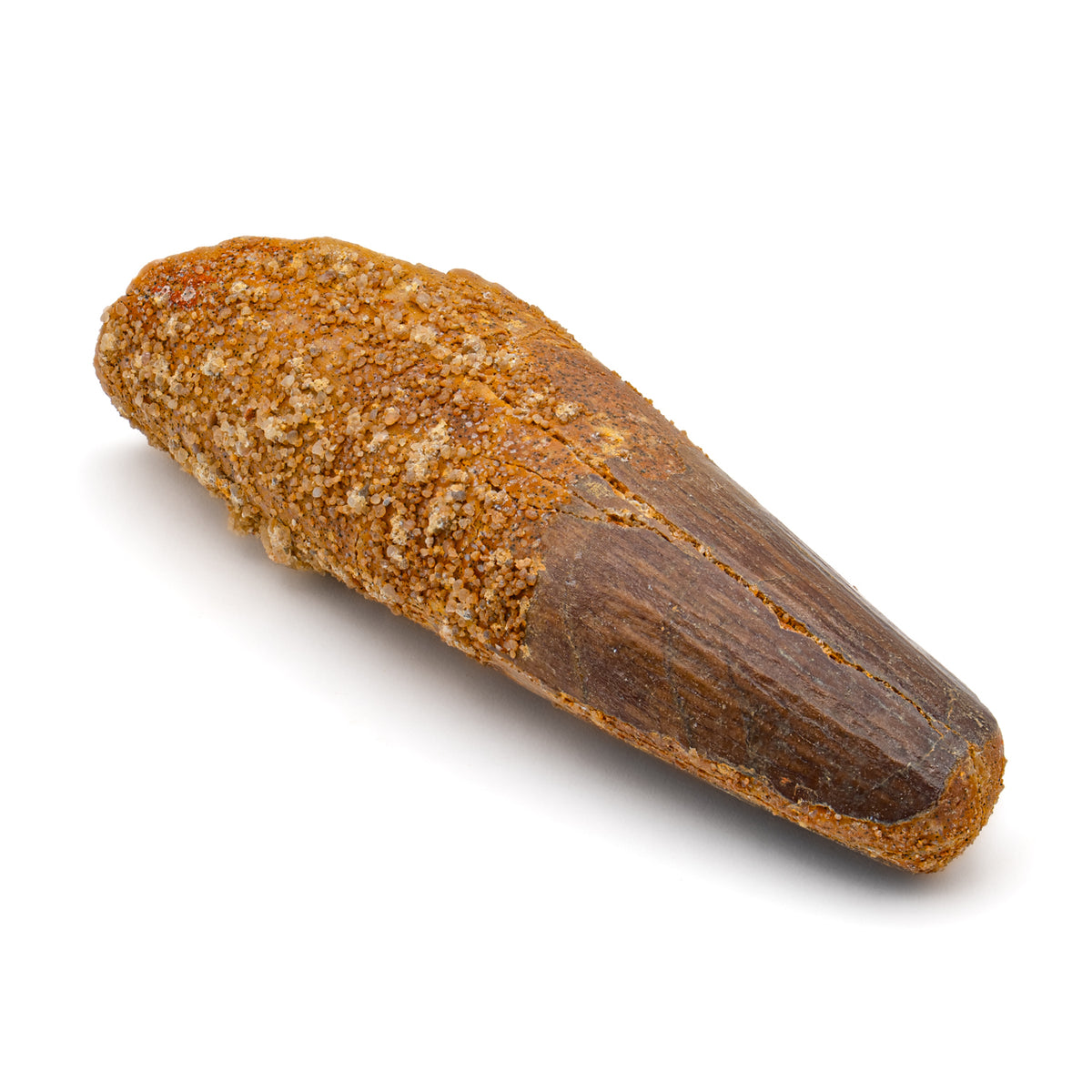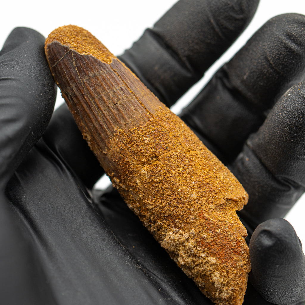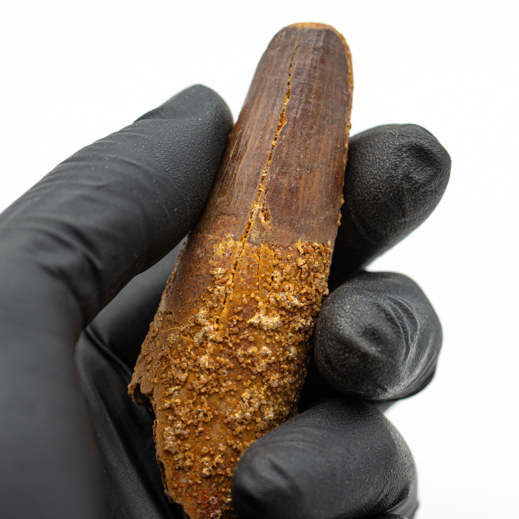 This specimen is a naturally worn crown and partial root of a real, fossilized Spinosaurus tooth from the Kem Kem fossil beds of Morocco. It measures 3.071" in length.