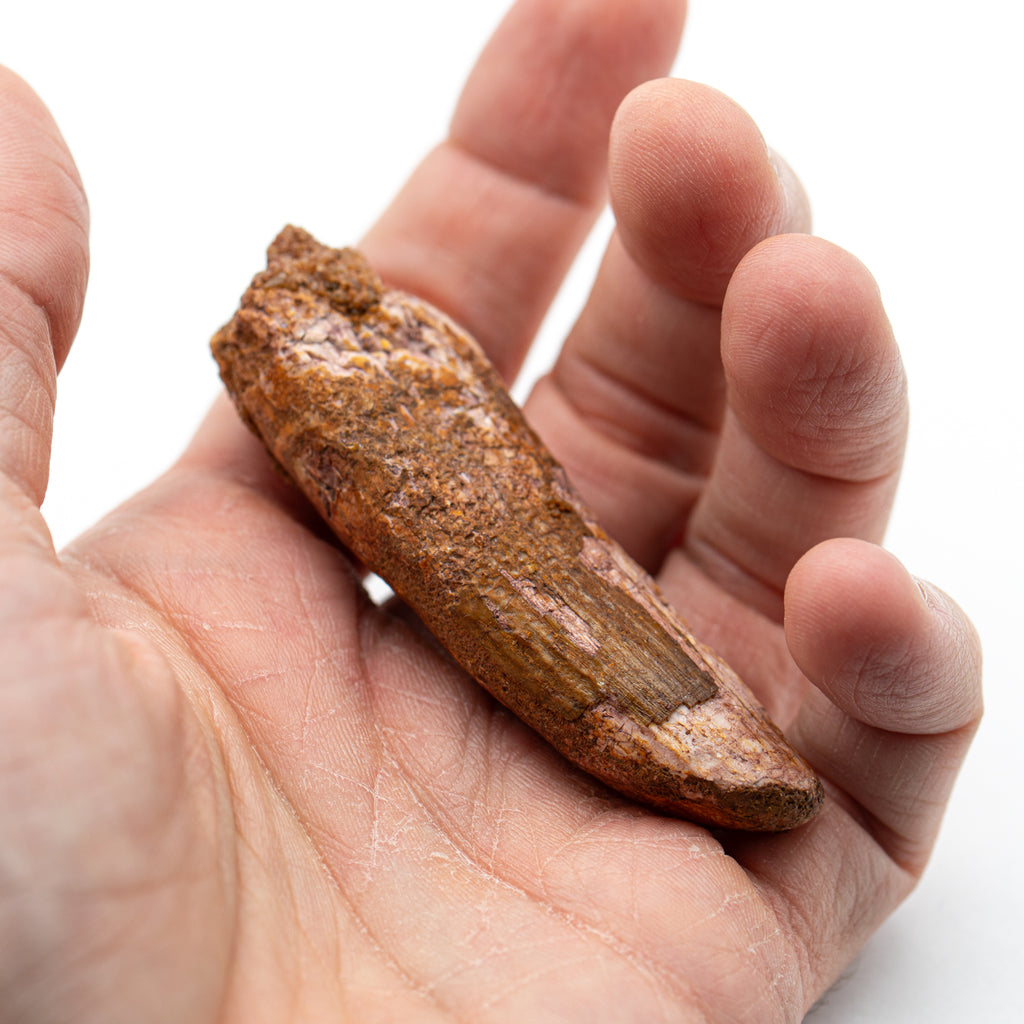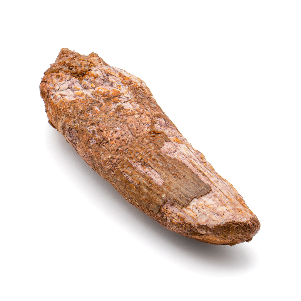 This specimen is a naturally worn crown and partial root of a real, fossilized Spinosaurus tooth from the Kem Kem fossil beds of Morocco. It measures 2.733" in length.