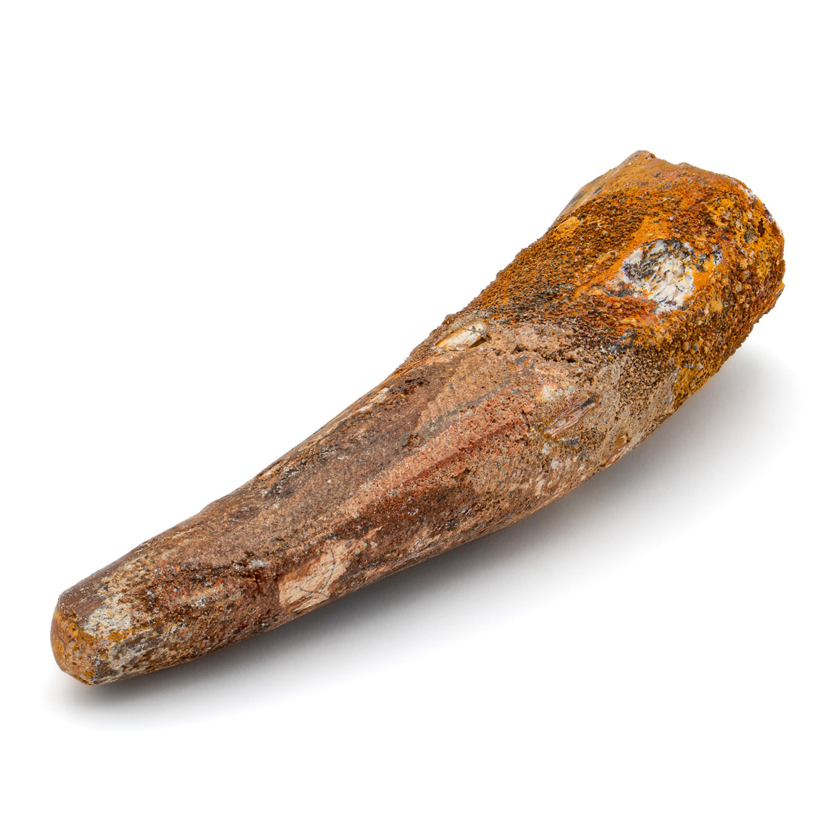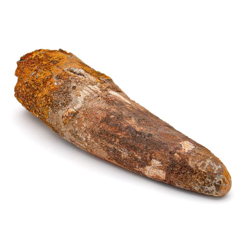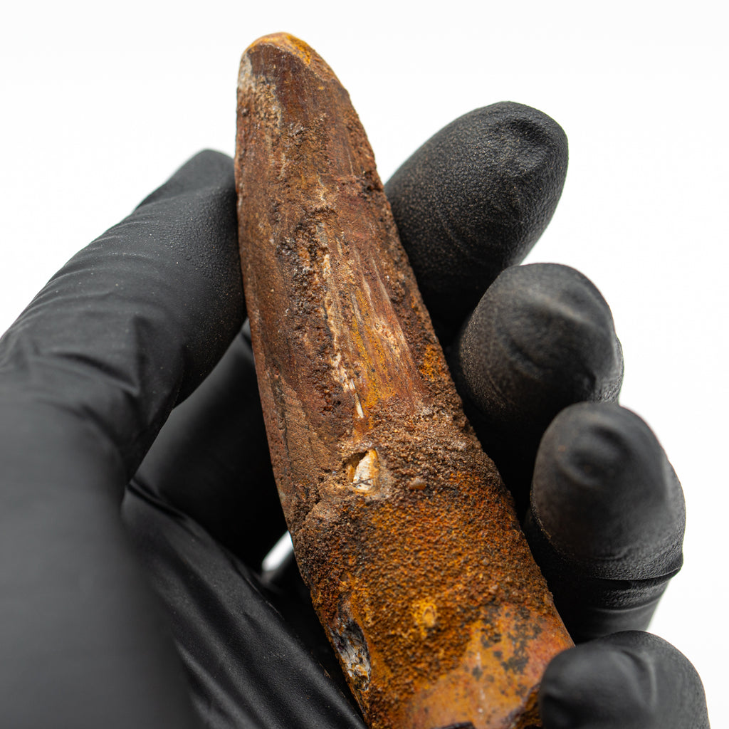 This specimen is a naturally worn crown and partial root of a real, fossilized Spinosaurus tooth from the Kem Kem fossil beds of Morocco. It measures 3.283" in length.