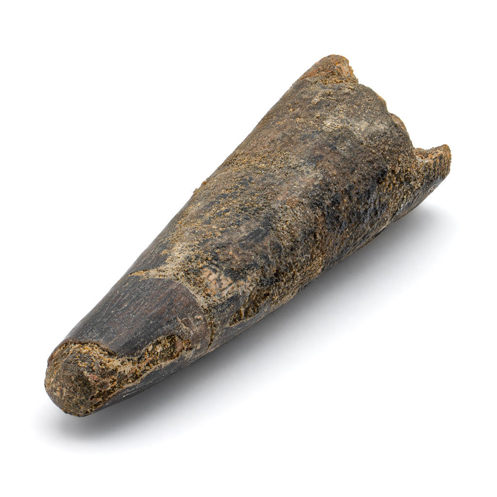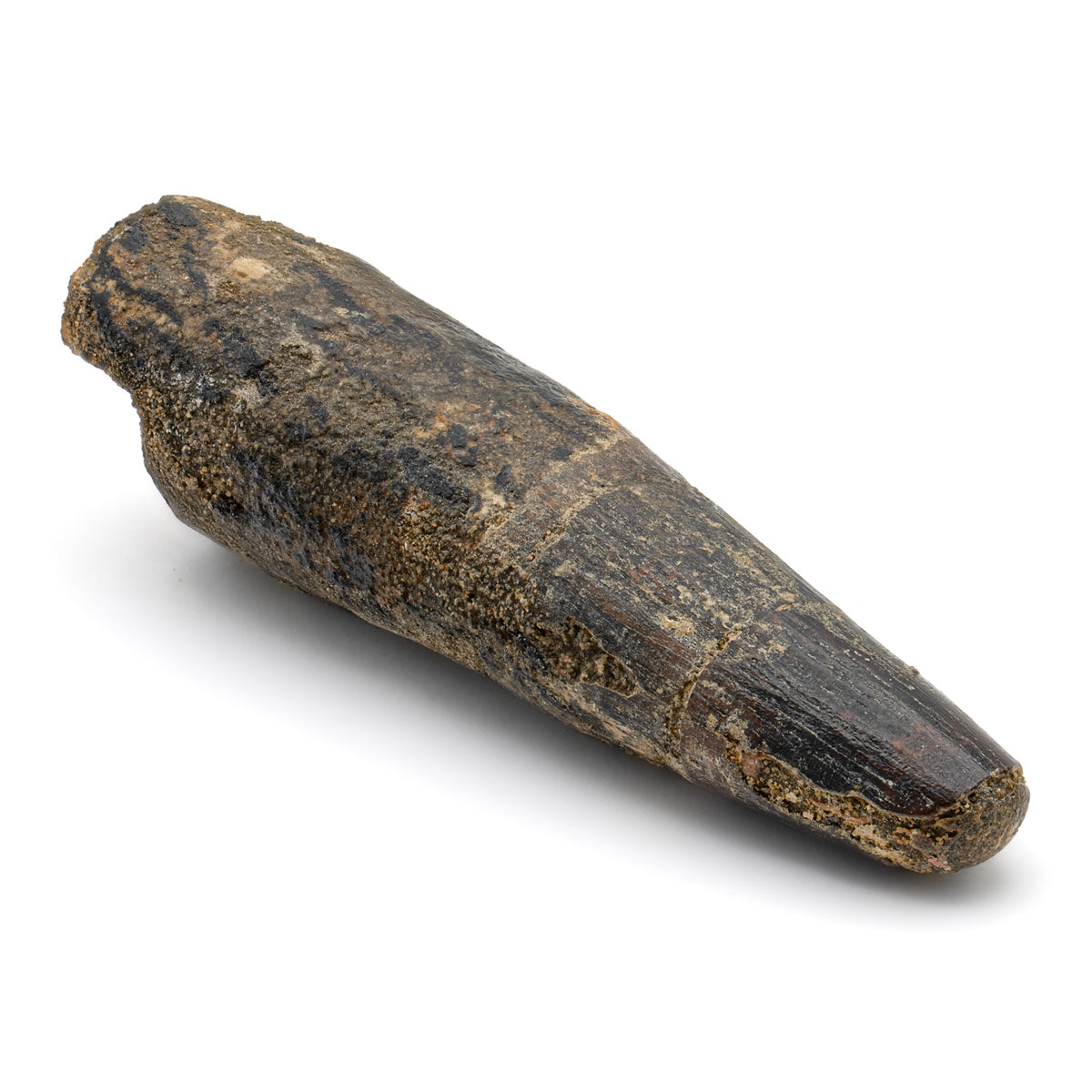 This specimen is a naturally worn crown and partial root of a real, fossilized Spinosaurus tooth from the Kem Kem fossil beds of Morocco. It measures 3.770" in length.