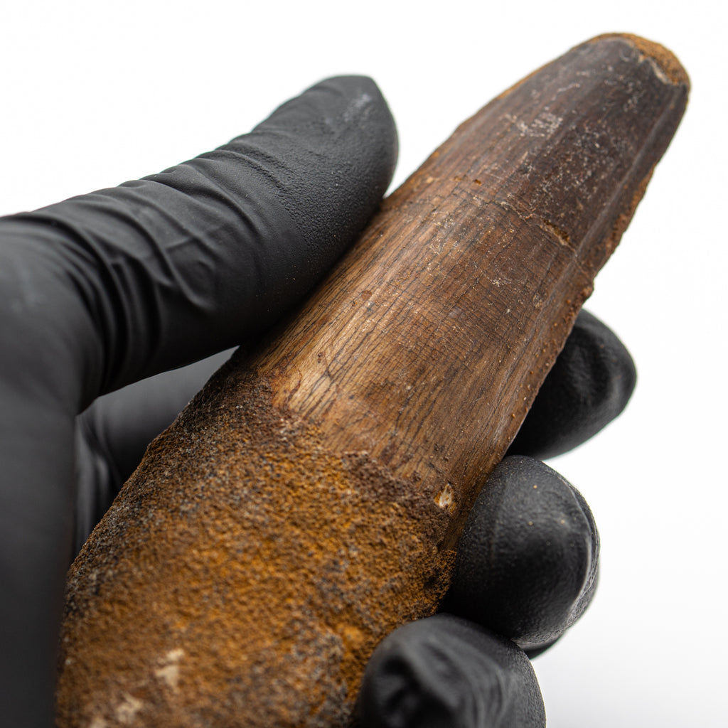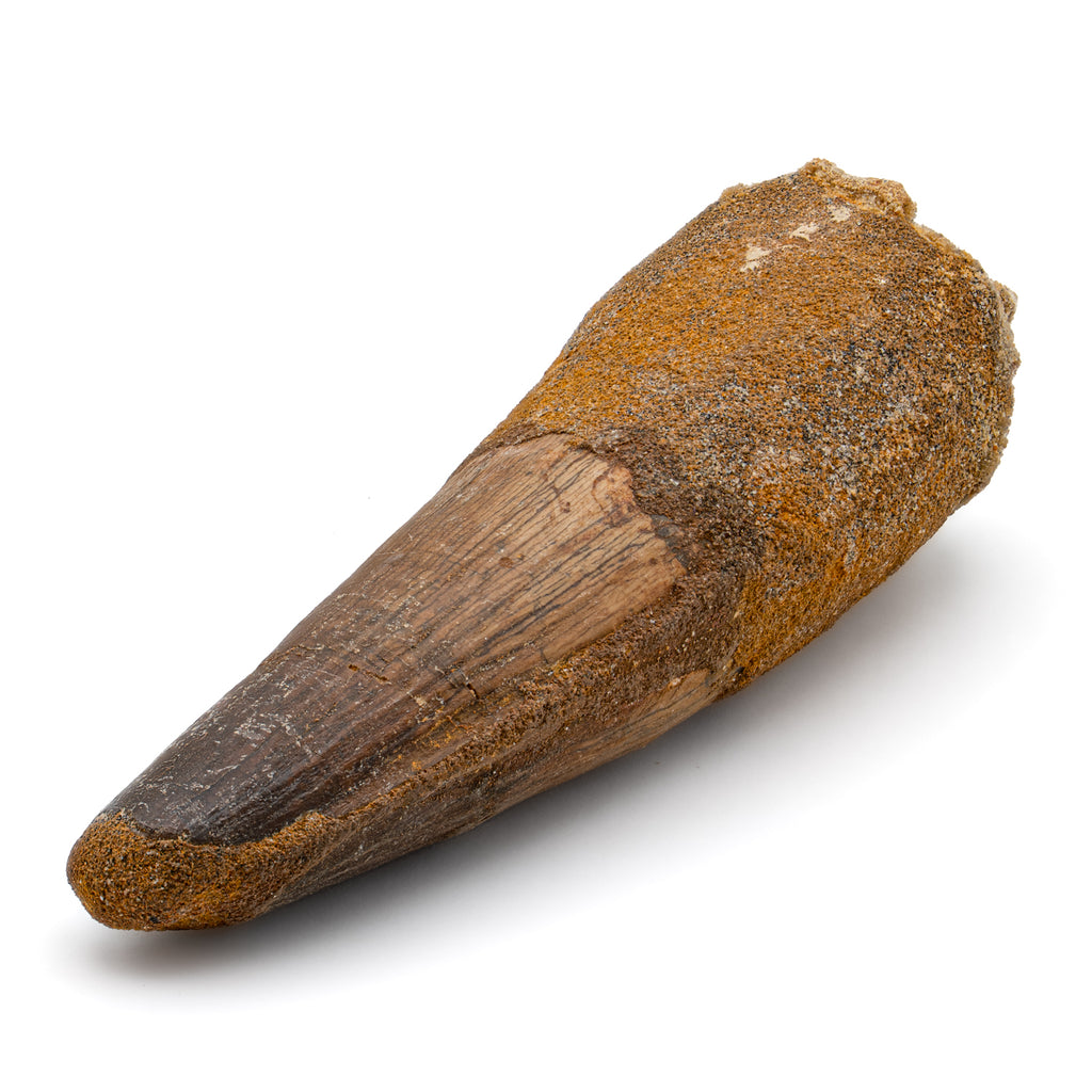 This specimen is a naturally worn crown and partial root of a real, fossilized Spinosaurus tooth from the Kem Kem fossil beds of Morocco. It measures 3.983" in length.