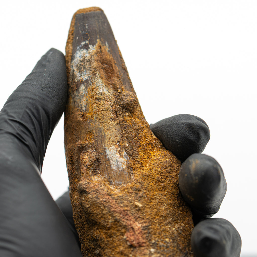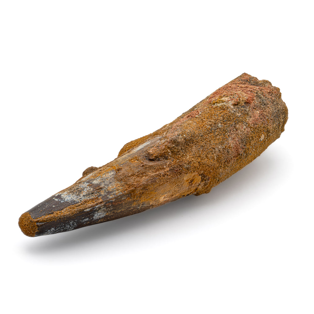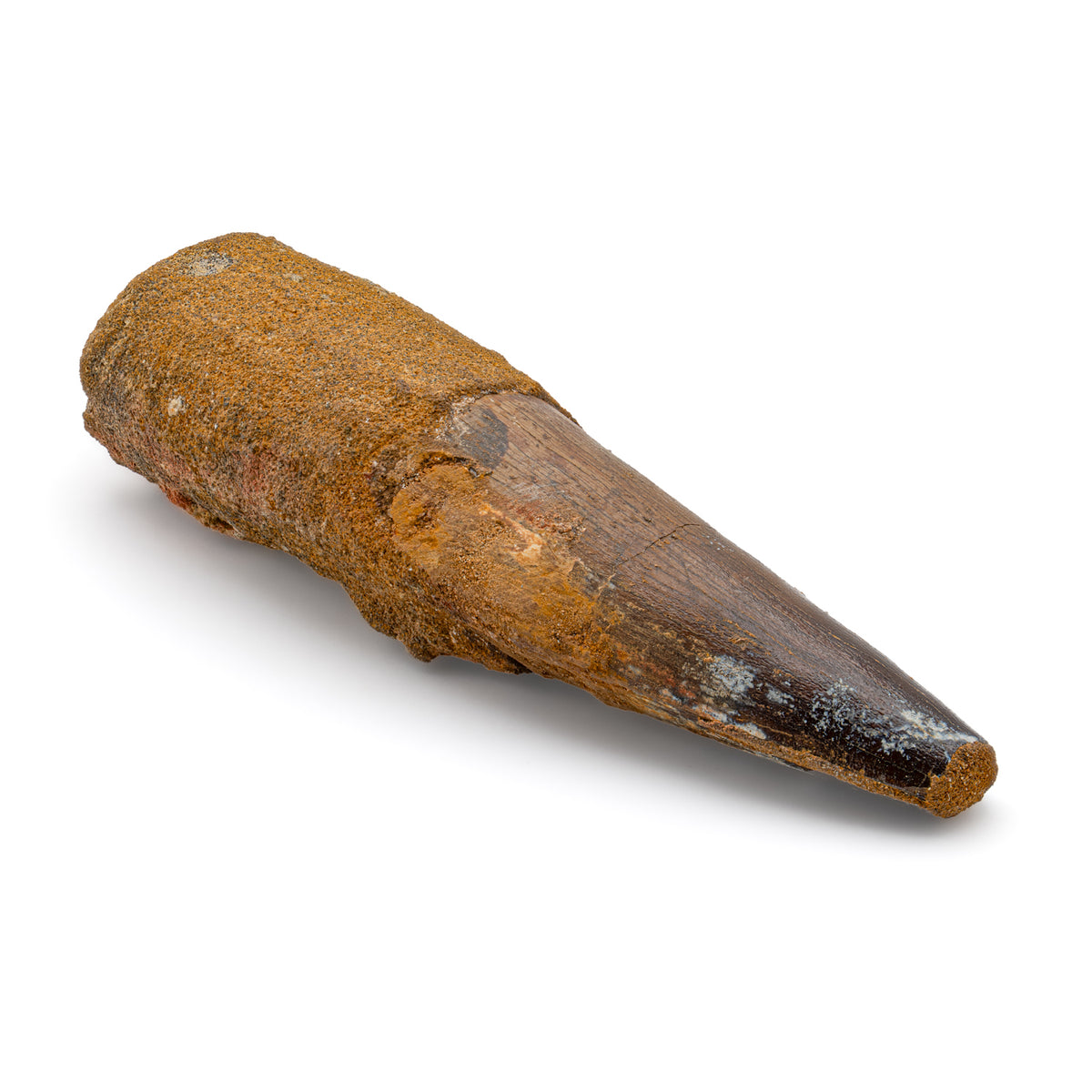 This specimen is a naturally worn crown and partial root of a real, fossilized Spinosaurus tooth from the Kem Kem fossil beds of Morocco. It measures 5.753" in length.