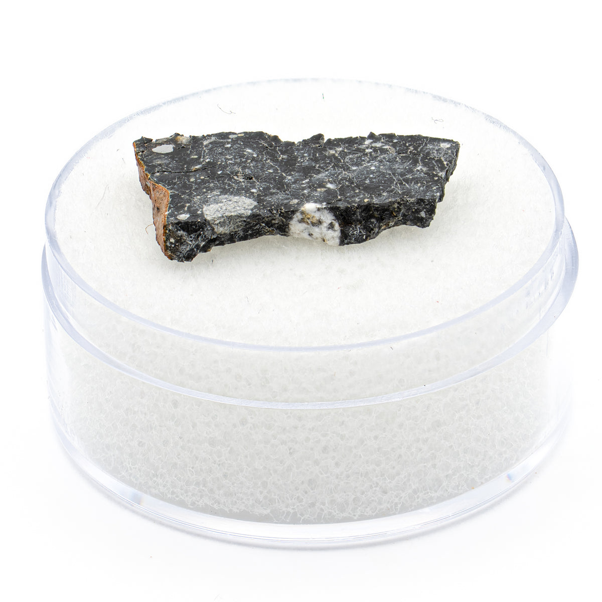 This specimen is a 1.34g piece of lunar meteorite NWA 13951, first identified in Mauritania in 2021. 13951 is a lunar feldspathic breccia, suggesting its origin point lies somewhere in the highlands, an area unexplored by the Apollo missions and thus ripe for research.