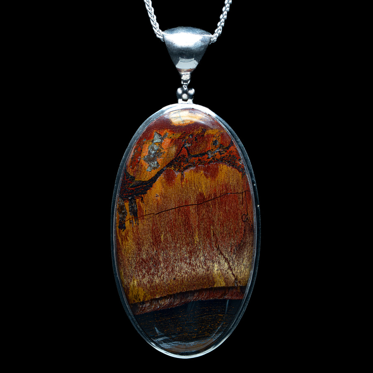 This pendant contains a polished piece of tiger iron, a form of banded iron from Western Australia. Tiger iron from this location formed 3,020,000,000 years ago during the Great Oxygenation Event, a period where cyanobacteria photosynthesized massive amounts of free oxygen, creating the atmosphere we breathe today.